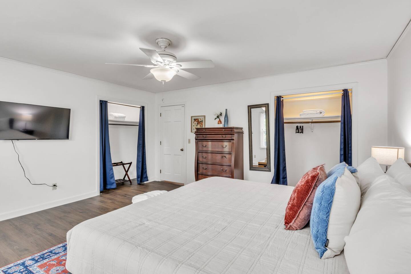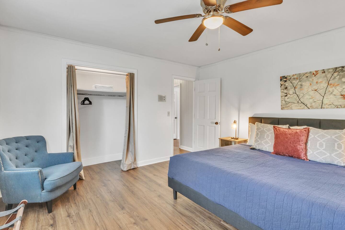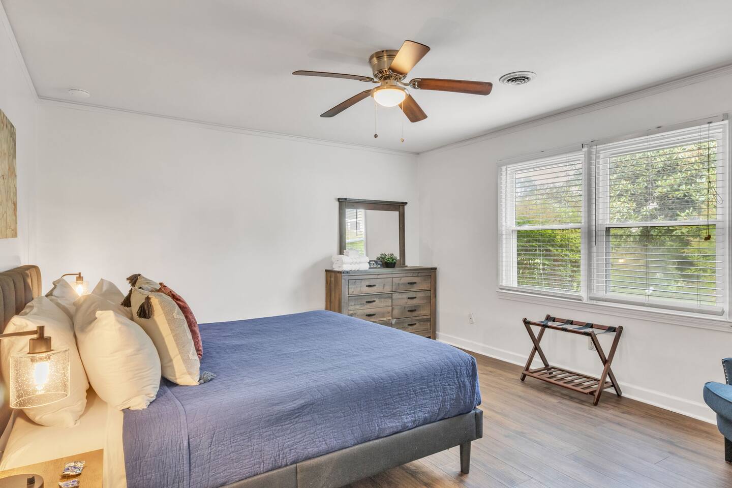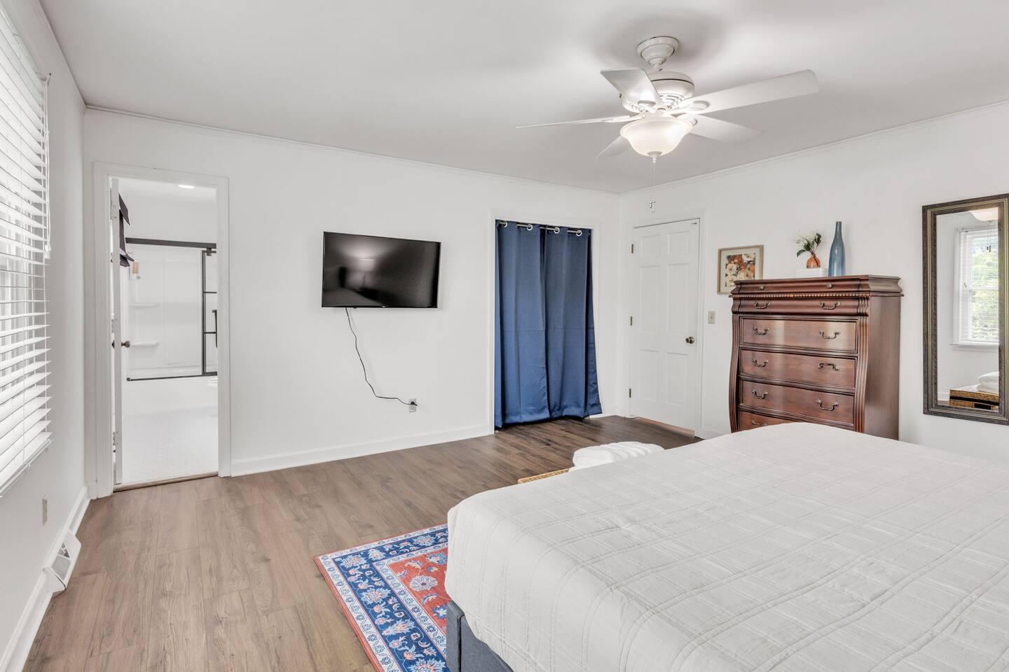 Welcome to Artist's Haven- our beautifully appointed 4-bedroom, 3-bathroom home located on the highly sought-after Eastside of Greenville. Situated in a desirable residential area, this charming abode offers a comfortable and luxurious stay for guests. With 2 laundry rooms and the downstairs suite, our home is perfect for families who wish to enjoy time with one another- but also appreciate privacy at the end of a long day exploring Greenville. As you arrive, you'll be greeted by a spacious 2-car garage equipped with an electric vehicle charger, ensuring convenience for eco-conscious travelers. Step into the backyard oasis, complete with an outdoor eating area for al fresco dining, a cozy fire pit for evening gatherings, and a badminton net for some friendly competition. Inside, the primary bedroom awaits, boasting a plush king-sized bed and an en-suite bathroom for added privacy and relaxation. The en-suite bathroom includes all the necessary towels and toiletries, ensuring a hassle-free stay. Additionally, there is a hall bathroom conveniently located for the other bedrooms with towels and toiletries as well. The two additional upstairs bedrooms offer a queen-sized bed and two full beds respectively, accommodating a variety of sleeping arrangements. Prepare delicious meals in the fully-equipped kitchen, which includes all the essentials for cooking and baking. Whether you're whipping up a quick breakfast or hosting a family dinner, this kitchen has you covered. Just off the kitchen is a designated work space, which provides a comfortable convenient space for those working from home. Proceeding downstairs, you'll immediately notice the modern and tastefully designed interior of this private suite, which includes its own bedroom, bathroom, laundry, living area, and kitchenette! The living area features comfortable seating, allowing you to relax and unwind after a long day of exploring the city. The fourth downstairs bedroom boasts a cozy and plush queen-sized bed, adorned with high-quality linens and pillows for a restful night's sleep. You'll find ample storage space for your belongings, including a spacious closet. The bathroom is sleek and contemporary, with a luxurious shower and a selection of plush towels. The fully stocked kitchenette is available for guest use. Equipped with top-of-the-line appliances, including a toaster, air fryer, refrigerator, and microwave, you'll have everything you need. The kitchen is also stocked with cookware, utensils, and dinnerware, ensuring a hassle-free eating experience. For entertainment and relaxation, the house features a sunroom filled with natural light upstairs and a spacious living area for everyone to unwind. Laundry is convenient with a complimentary washer/dryer and detergent. Exploring the local area is a breeze, with a beautiful park less than 5 minutes away and The Pavilion, a popular ice skating rink in Taylors, also nearby. The amenities of Downtown Greenville are just a short 15 minute drive away. Enjoy a hassle-free check-in experience with self check-in available, allowing you to arrive at your own convenience using an individualized entry code. Discover the best of Greenville from this exceptional Airbnb rental, offering a perfect blend of comfort, convenience, and luxury. *Pets are welcome in our home with a one-time fee, automatically applied when you add your pet as a guest during booking