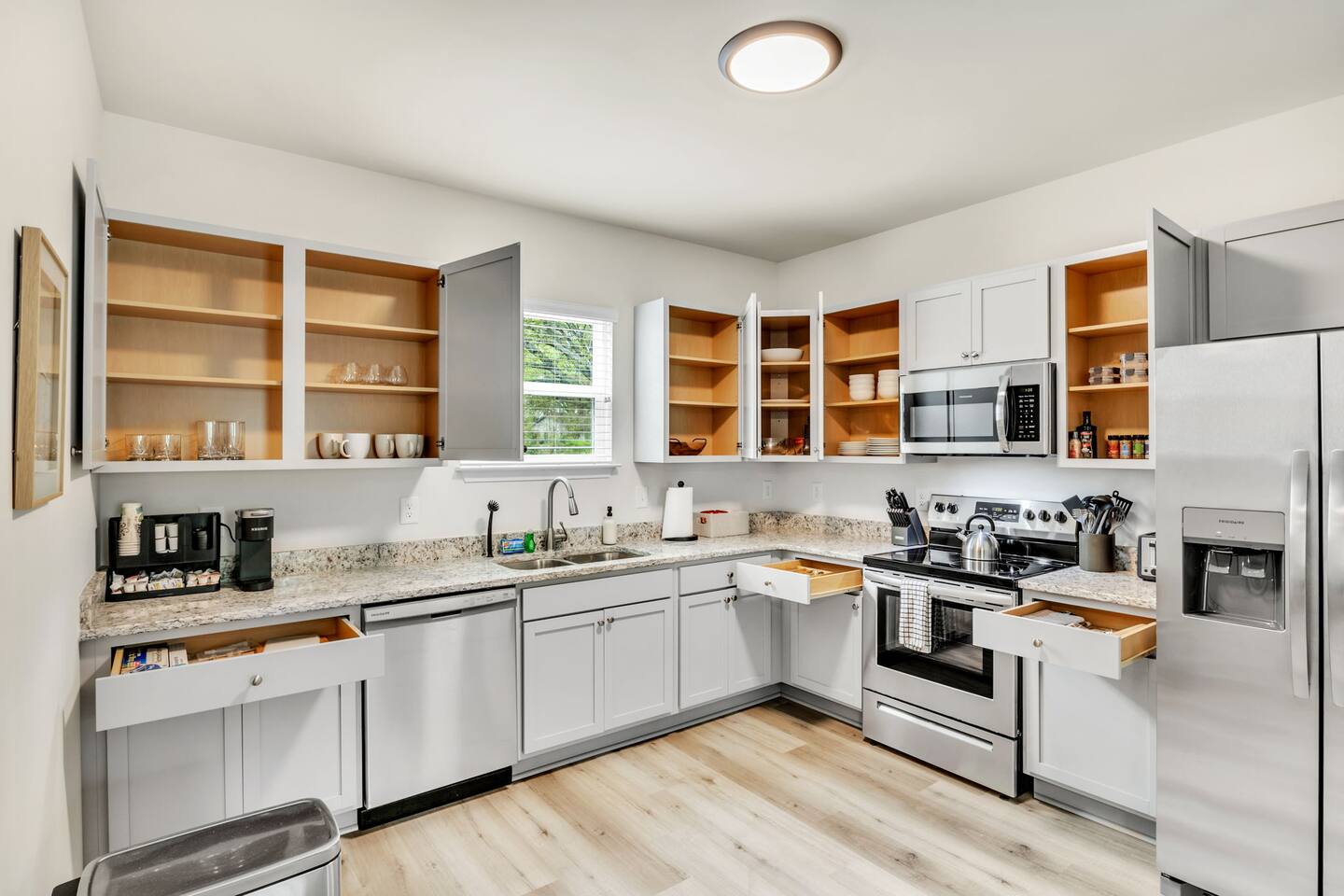 Welcome to Beverly Place, an extraordinary four-unit retreat in the heart of South Carolina! This one-of-a-kind property offers a versatile, enjoyable stay for family gatherings, weddings, and more – and it's pet friendly! Bring your furry friend along for a one-time fee of $250. Each unit boasts a full kitchen, equipped with all essentials, a dining area, and a comfortable living area featuring cozy furniture and a Smart TV, so you can access your own streaming services (no cable provided). The first-floor units (2 in total) present a luxurious primary suite with a King bed, nightstands, reading lamps, a Smart TV (no cable), and an en suite bathroom. The second bedroom offers two twin beds, nightstands, and reading lamps, and guests can use the full-sized hall bathroom. The second-floor units showcase King beds in both bedrooms, nightstands, and reading lamps. The primary suite is complete with a Smart TV and a full en suite bathroom, while the other King room benefits from the full-sized hall bathroom. Nestled in a prime location, Beverly Place is just 1 mile from Historic Downtown Greer, a lively area with shopping, dining, and entertainment options. Explore Downtown Greenville, only 25 minutes away, or Downtown Traveler's Rest, a short 20-minute drive. Experience a unique and memorable stay at Beverly Place, where comfort meets convenience in a stunning, pet-friendly setting. For your convenience, here is our distance from several popular wedding venues: Historic Greer Depot - 4min Red Dutch Barn - 10min. The School House Venue - 16min The Barn at Poplar Springs Farm - 25min Hotel Domestique - 27min The Cliffs at Glassy - 33min Pretty Place Chapel - 1 hour