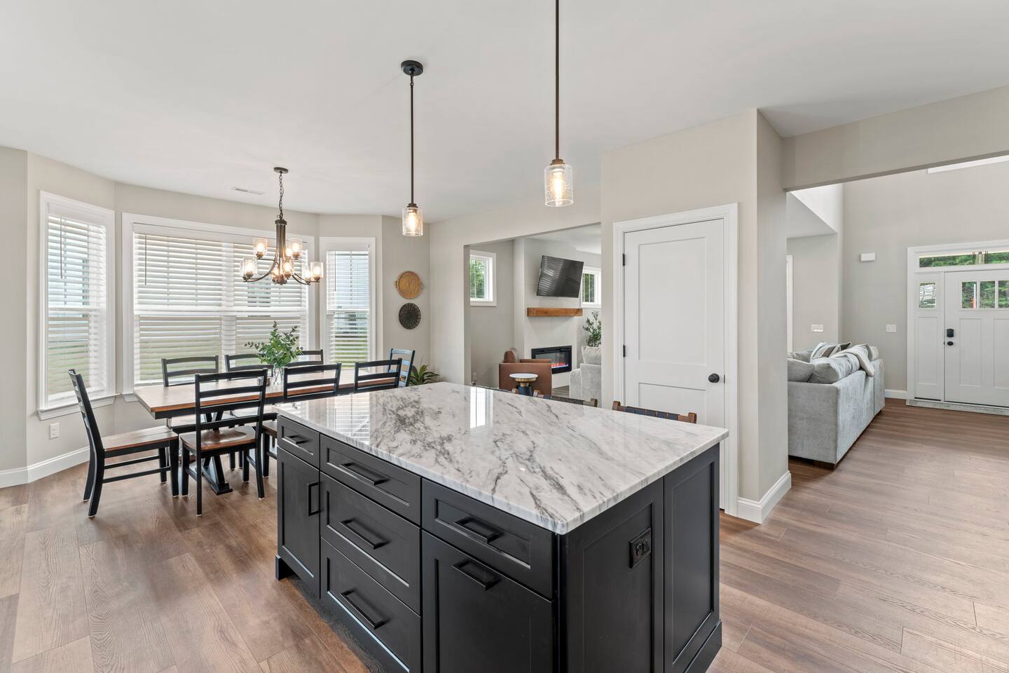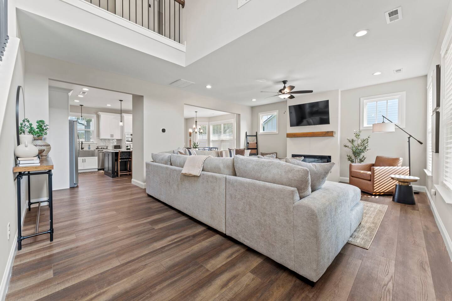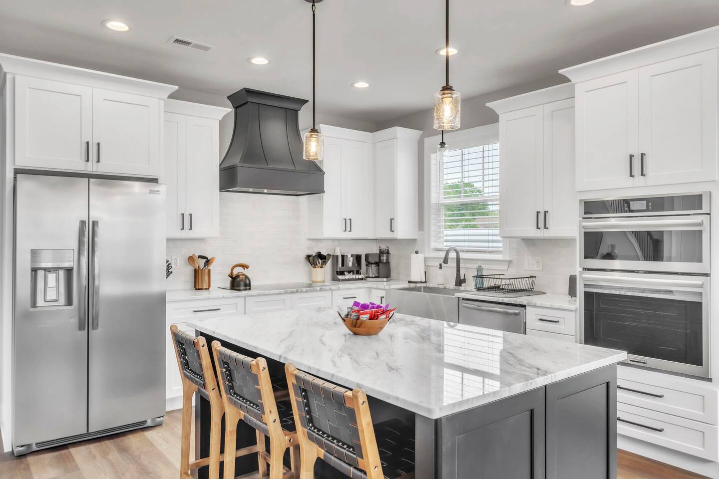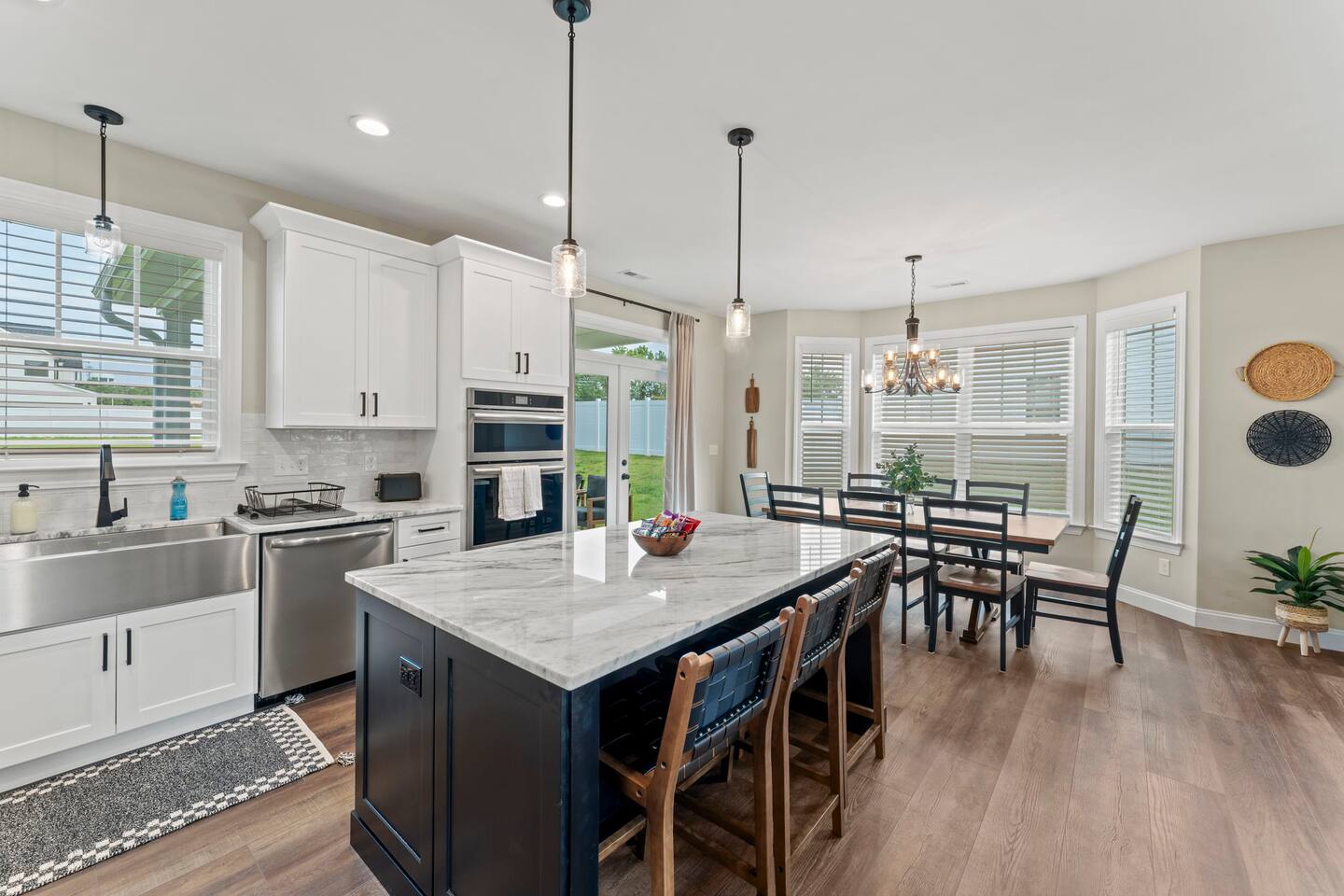 Welcome to your Greer getaway—where stylish design, spacious comfort, and a central location come together to create the perfect retreat for your next getaway. This beautifully decorated 4-bedroom, 2.5-bath home sleeps ten and offers thoughtful touches throughout, from its elevated finishes to its inviting layout. Conveniently located just 20 minutes from Downtown Greenville, 10 minutes from Downtown Greer, and minutes from several popular wedding venues, outdoor attractions, and breweries, this home puts you in the perfect spot to explore everything the area has to offer. Specifically, we are located: - 7 minutes from Aurora Farms - 7 minutes from Edinburgh West - 10 minutes from The Davenport - 12 minutes from The School House Venue Once you arrive, step inside and be greeted by an open-concept living area filled with natural light, LVP flooring throughout, and a cozy fireplace at the center of it all. The main living room is anchored by a plush sectional and sleek furnishings, creating the perfect space to relax, gather, or unwind after a day exploring the Upstate. The kitchen is a dream to cook in, featuring a large island, quartz countertops, a farmhouse sink, and modern appliances including an induction cooktop, a wall oven, a convection microwave, and a dishwasher. Whether you're preparing a full dinner or just brewing your morning coffee, you'll have everything you need at your fingertips. The adjacent dining area offers seating for your whole group to eat, work, or plan your next adventure. The primary bedroom, located on the main floor for added privacy, features a king bed, double nightstands with lamps, a dresser, and a smart TV (no cable; streaming services only, using your personal logins). The en-suite bathroom features a walk-in shower, a separate soaking tub, and a double vanity. Upstairs, you'll find three more bedrooms with Smart TVs (no cable, streaming-only)—two with king beds and one with two queen beds—each decorated with comfort and style in mind. There's also a bonus loft living area with an additional sectional sofa and TV, providing everyone with room to spread out and relax. However, one of the best features of this home is what awaits outside: a huge, fully fenced backyard that offers space to roam, relax, or let pets play freely. The covered patio features a lounge area and grill, perfect for cozy evenings under the stars. There's also a covered front porch with rocking chairs, perfect for enjoying your morning coffee or evening wine. Whether you're here for a weekend event, visiting family, or simply seeking a stylish home base, this centrally located property offers space, style, and Southern charm. Pets are welcome with a fee.