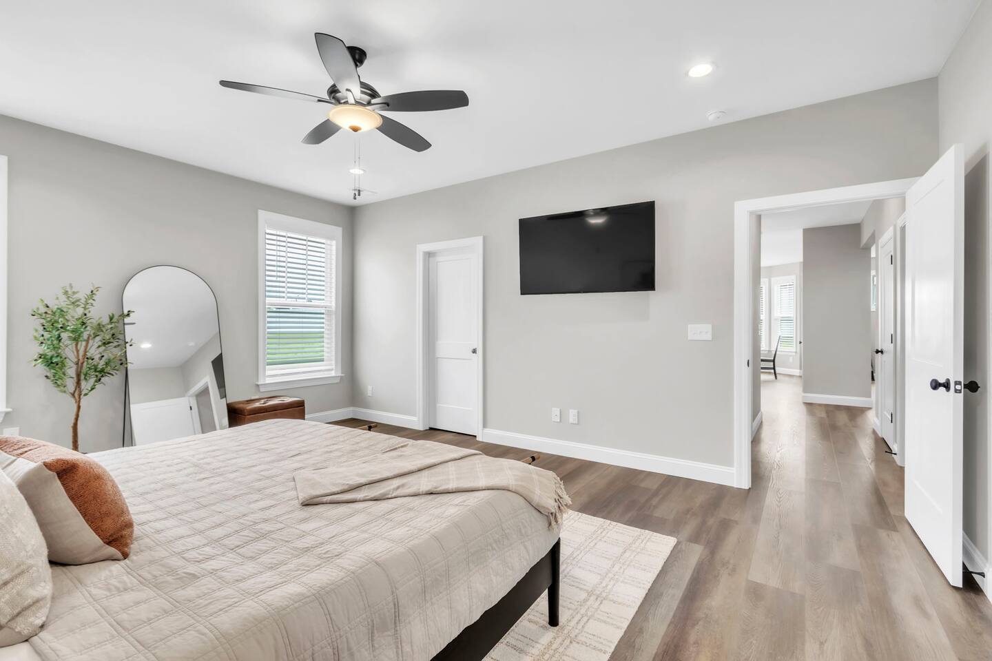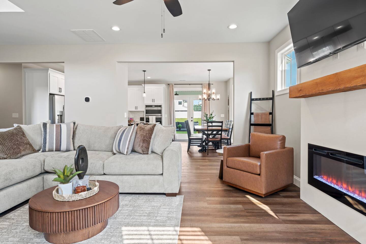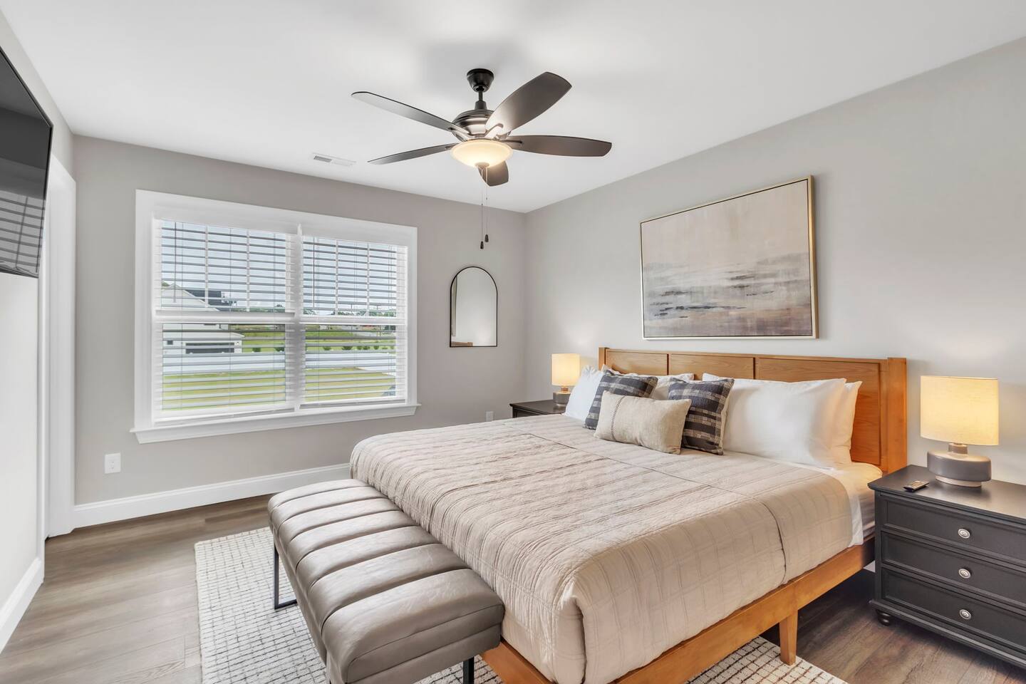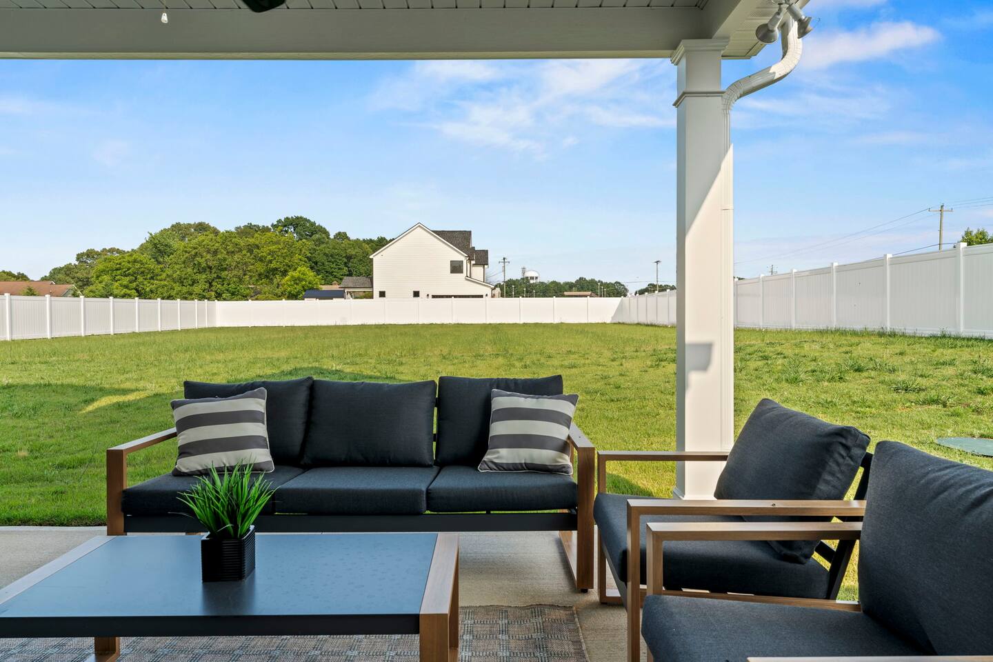 Welcome to your Greer getaway—where stylish design, spacious comfort, and a central location come together to create the perfect retreat for your next getaway. This beautifully decorated 4-bedroom, 2.5-bath home sleeps ten and offers thoughtful touches throughout, from its elevated finishes to its inviting layout. Conveniently located just 20 minutes from Downtown Greenville, 10 minutes from Downtown Greer, and minutes from several popular wedding venues, outdoor attractions, and breweries, this home puts you in the perfect spot to explore everything the area has to offer. Specifically, we are located: - 7 minutes from Aurora Farms - 7 minutes from Edinburgh West - 10 minutes from The Davenport - 12 minutes from The School House Venue Once you arrive, step inside and be greeted by an open-concept living area filled with natural light, LVP flooring throughout, and a cozy fireplace at the center of it all. The main living room is anchored by a plush sectional and sleek furnishings, creating the perfect space to relax, gather, or unwind after a day exploring the Upstate. The kitchen is a dream to cook in, featuring a large island, quartz countertops, a farmhouse sink, and modern appliances including an induction cooktop, a wall oven, a convection microwave, and a dishwasher. Whether you're preparing a full dinner or just brewing your morning coffee, you'll have everything you need at your fingertips. The adjacent dining area offers seating for your whole group to eat, work, or plan your next adventure. The primary bedroom, located on the main floor for added privacy, features a king bed, double nightstands with lamps, a dresser, and a smart TV (no cable; streaming services only, using your personal logins). The en-suite bathroom features a walk-in shower, a separate soaking tub, and a double vanity. Upstairs, you'll find three more bedrooms with Smart TVs (no cable, streaming-only)—two with king beds and one with two queen beds—each decorated with comfort and style in mind. There's also a bonus loft living area with an additional sectional sofa and TV, providing everyone with room to spread out and relax. However, one of the best features of this home is what awaits outside: a huge, fully fenced backyard that offers space to roam, relax, or let pets play freely. The covered patio features a lounge area and grill, perfect for cozy evenings under the stars. There's also a covered front porch with rocking chairs, perfect for enjoying your morning coffee or evening wine. Whether you're here for a weekend event, visiting family, or simply seeking a stylish home base, this centrally located property offers space, style, and Southern charm. Pets are welcome with a fee.