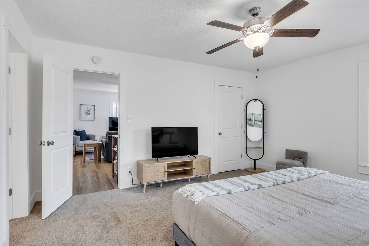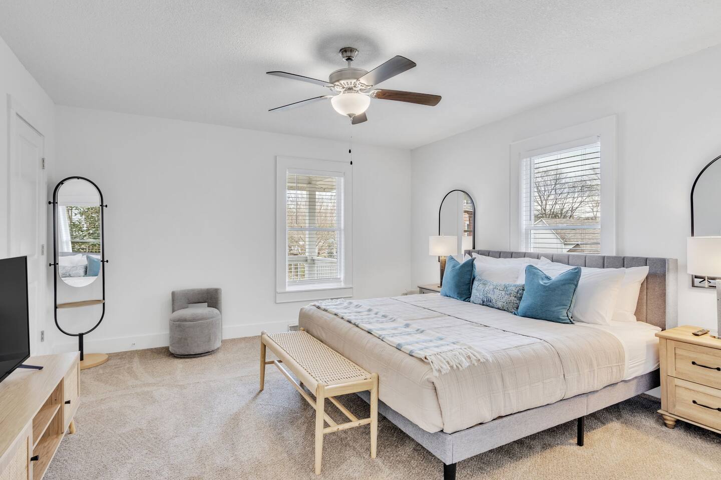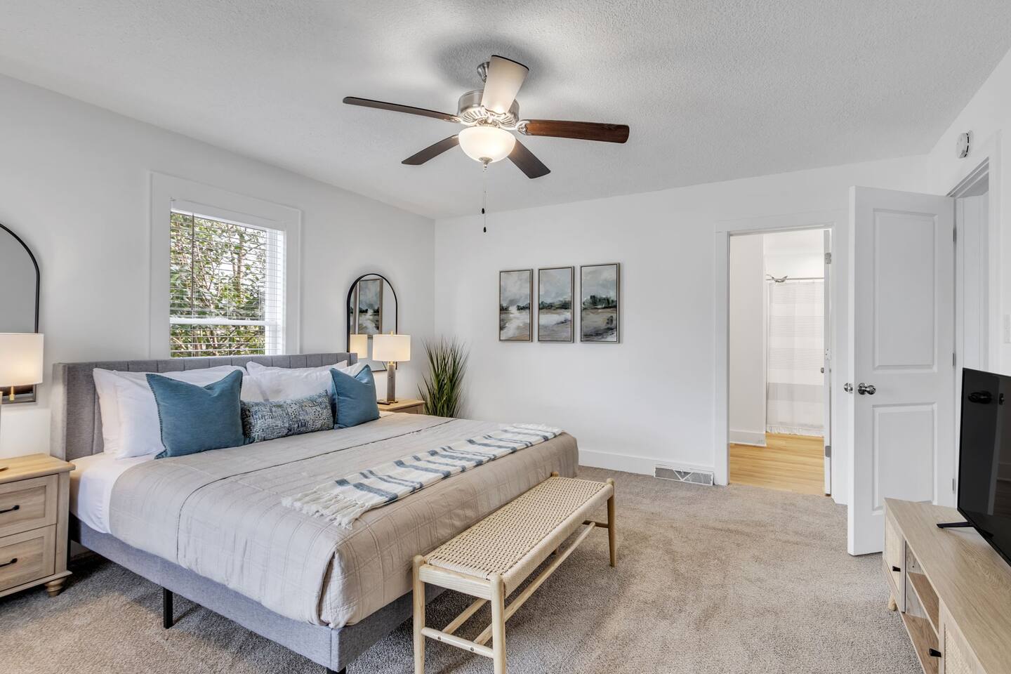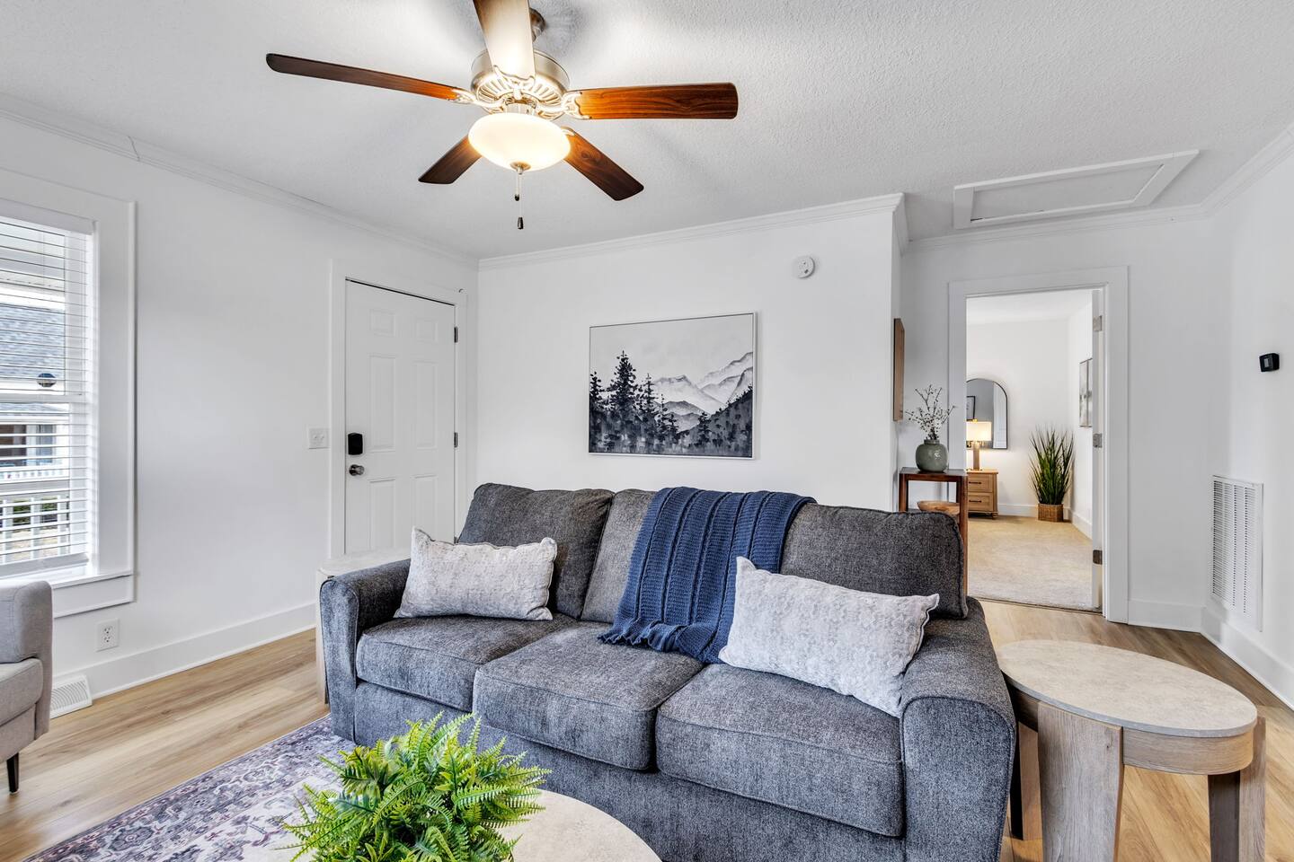 Discover The Cottage @ Trail’s End, a beautifully curated 2-bedroom, 2-bathroom retreat that perfectly balances modern comfort with a charming aesthetic, located a short 1/4 mile walk from the Swamp Rabbit Café, which has direct access to the Swamp Rabbit Trail. Whether you're here for business, a family getaway, or a spontaneous adventure, this home offers the ideal setting to unwind and explore the vibrant surroundings of Greenville. Each king bedroom invites you to relax in style, with plush bedding, tasteful décor, and plenty of space to make yourself at home. Both rooms have their own full bathroom, providing privacy and convenience for all guests. If work is on your agenda, take advantage of the dedicated workspace and reliable high-speed WiFi, or settle in at the dining table for a change of scenery. The kitchen blends style and function, featuring modern appliances, ample counter space, and thoughtful design touches that make cooking and dining effortless. Whether preparing a full meal or a quick snack, you'll find everything you need within reach. The dedicated laundry area with a washer and dryer adds extra convenience, making it easy to refresh your wardrobe during longer stays. This space is designed for both practicality and comfort, ensuring a seamless experience. The heart of the home is its cozy living area, complete with a Smart TV in the living room and both bedrooms, perfect for streaming your favorite shows— just log in with your own accounts! Step outside to the covered front porch, a welcoming spot for morning coffee or an evening wind-down, and enjoy the ease of driveway parking. Nestled near the historic mill district, you’ll find yourself within easy reach of Greenville’s top attractions: - Swamp Rabbit Trail — 2 minutes - Falls Park on the Reedy — 10 minutes - Downtown Greenville — 10 minutes - Downtown Travelers Rest — 10 minutes - Paris Mountain State Park — 15 minutes - Table Rock State Park — 35 minutes - Caesars Head State Park — 40 minutes Please note: For the comfort of all guests, this home is strictly pet-free due to owner allergies. Ideal for travelers seeking a blend of comfort and convenience, The Cottage @ Trail’s End is more than just a place to stay—it’s a home away from home. Book now and experience a Greenville getaway that caters to relaxation, exploration, and everything in between!