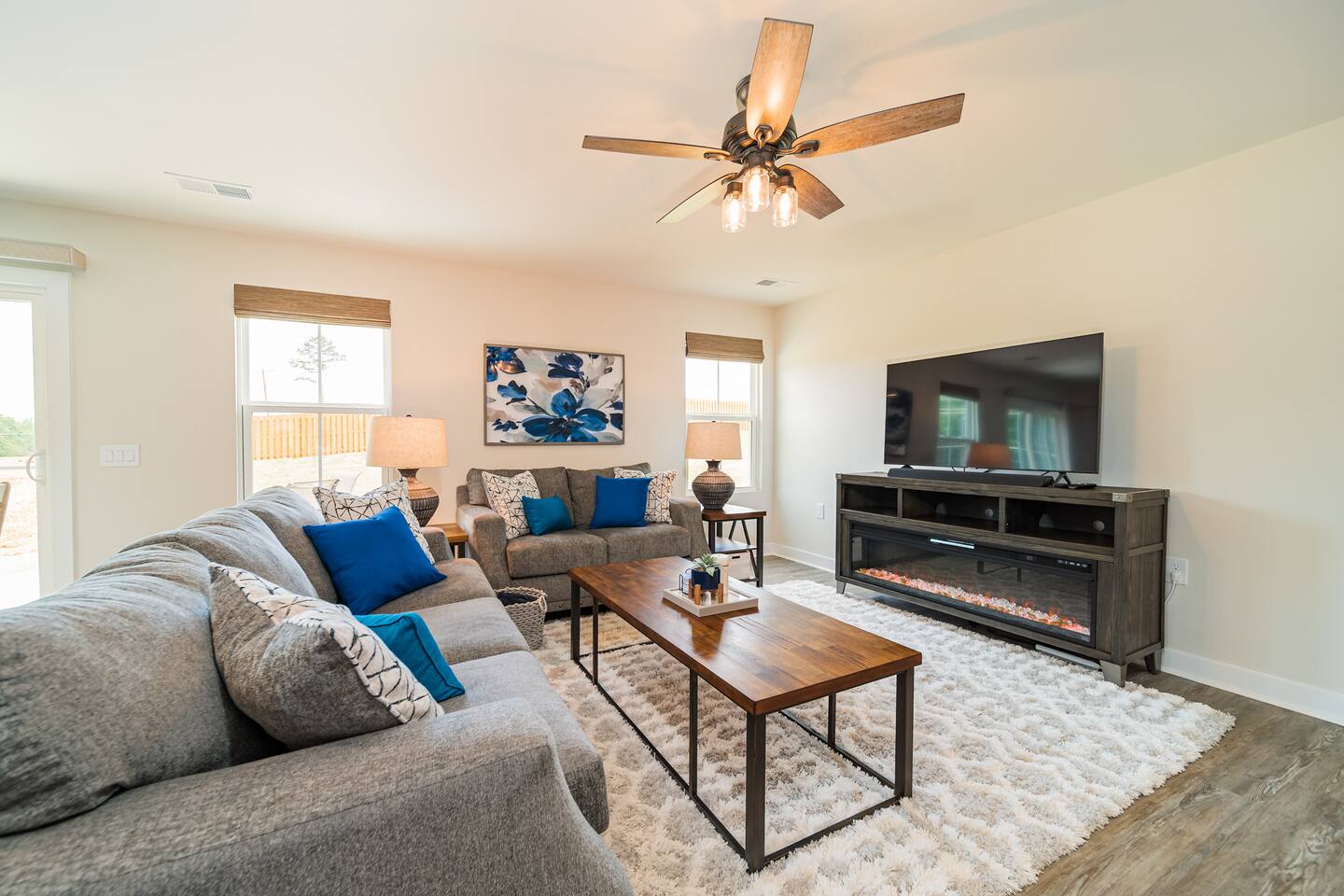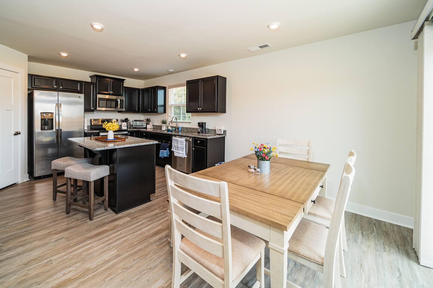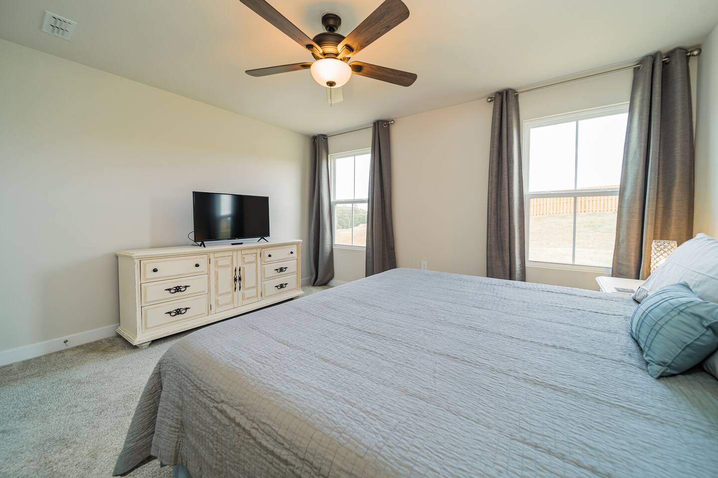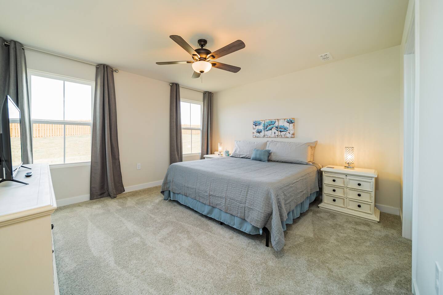 Welcome to Creekstone Cottage: a retreat that feels like home, perfectly designed for stays of 1 to 6 months. Nestled in a newly developed subdivision, the residence effortlessly blends sophistication and comfort. As you arrive, a spacious driveway and 2-car garage make for a smooth entry. A thoughtfully designed foyer greets you, offering convenient storage solutions for your shoes and bags. As you step further inside, you'll find a beautifully furnished Queen Room and a flexible Twin Room that doubles as a home office to your immediate left. Continue down the inviting hallway to discover an expansive, open-concept living area. Anchored by a fully equipped kitchen featuring a spacious island and high-quality stainless steel appliances, the space is ideal for crafting homemade culinary delights. Adjacent to the kitchen, a dining area with seating for six seamlessly transitions to a charming backyard patio, perfect for al fresco meals or relaxation. When it’s time to unwind, settle into the cozy living room featuring plush sofas, a Smart TV for streaming, and an ambient electric fireplace. Privacy is prioritized with the Master Suite set slightly apart from the main living area and other bedrooms. It boasts a luxurious King Bed equipped with a Purple mattress, a large TV, and an en-suite bathroom featuring a double vanity, a stall shower, and access to a generous walk-in closet. The front-facing Queen Room and the Twin Room both offer stylish furnishings and functional spaces, with the Twin Room also featuring a sit-to-stand desk for your work needs. Pet lovers can rejoice, as we welcome your furry friends for an additional fee ($250 for the first pet and $100 for each subsequent pet). We are committed to ensuring an exceptional experience for our guests. If you have any questions or need assistance planning your stay, please don't hesitate to reach out. We look forward to hosting you at Creekstone Cottage, your ultimate home away from home.