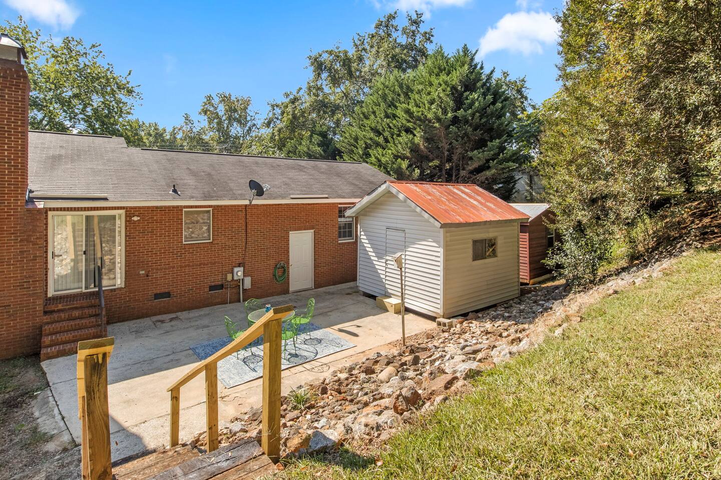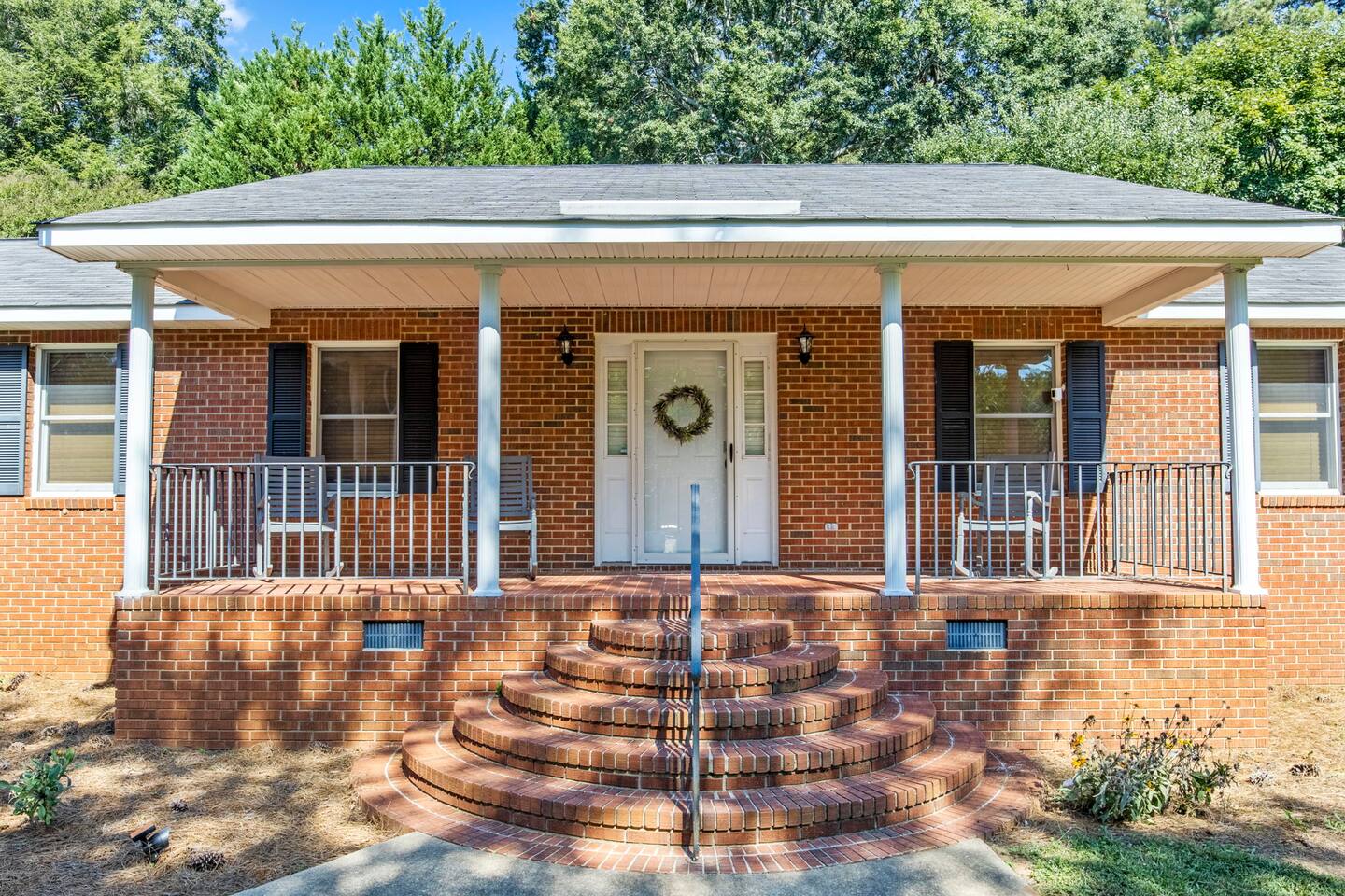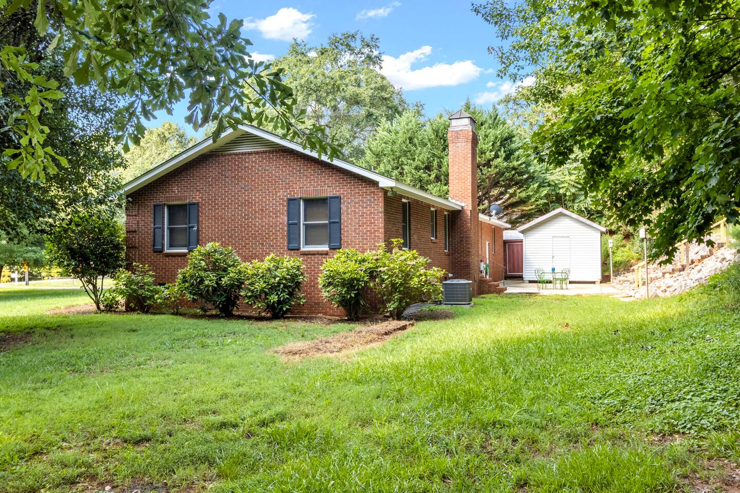 Located by a babbling brook and surrounded by the peaceful sounds of nature, Finch Landing is sure to charm those retreating to the upstate for their extended stay (30 days-6 month rental). With utilities included and pets welcome ($250 fee; $100 per additional pet), we make it easy for guests to move in and feel at home at our creekside cottage. Upon arrival at the property, guests will be greeted with mature trees, curated landscaping, and our picturesque creek- which includes a bridge for your enjoyment. Guests may use one space in the 2-car garage. Guests may enter the home either through the front door, with its spacious front porch, or through the garage door. Inside our home, you may relax in our spacious living room and play board games, talk with friends and family, or enjoy a tv show or movie (tv is Roku-enabled for guest accounts). Our living room boasts a brand new, comfortable sectional and a gorgeous desk and chair for a convenient work space for guests. Off the living room, guests may enter the kitchen, which is equipped with all you need to prepare a meal. The kitchen has plenty of counter space, with a peninsula area for prepping food. The kitchen flows smoothly into the dining area, which boasts a unique charm with its brick fireplace (The fireplace is not for guest use at this time). Our table includes a bench and four chairs and seats six individuals. Off the dining area and entryway is the main hallway, connecting the two bedrooms, hall bathroom, and laundry on each end. Our laundry room includes a brand new washer and dryer for guest use and has ample storage with a large row of cabinets. The queen bedroom includes comfortable bedding and two large closets for guest use. There is a second desk and chair in this bedroom to provide more working space for your convenience, and a nightstand and lamp. This bedroom also has a television for guests to enjoy at the end of a long day (Roku enabled for guest accounts). Along this hallway is the first bathroom, which includes modern new finishes, a single vanity, a toilet, and a tub/shower combination. Across the hallway is the master bedroom, which includes its own en-suite bathroom with a tub/shower combination, toilet, and single vanity with a sleek vessel sink. Guests may enjoy the comfort of resting in our plush king sized bed. This room includes two nightstands with accompanying lamps, a large closet, and a spacious dresser for storage. Atop the dresser is a second television, which is also equipped with Roku for guests to log into their accounts. One of the most unique aspects of this home is the beautiful outdoor space. Mature trees line the back of the house alongside the patio area, where you can enjoy watching the birds at our numerous feeders. This truly is a woodland oasis for you, your family, and your friends to enjoy. In the backyard is a locked white storage building, which guests may also use for their items as needed. Pets are welcome to join you with a fee of $250 for the first pet and $100 for each additional pet. All utilities are included in the rental price. We can't wait to welcome you home to Finch Landing.