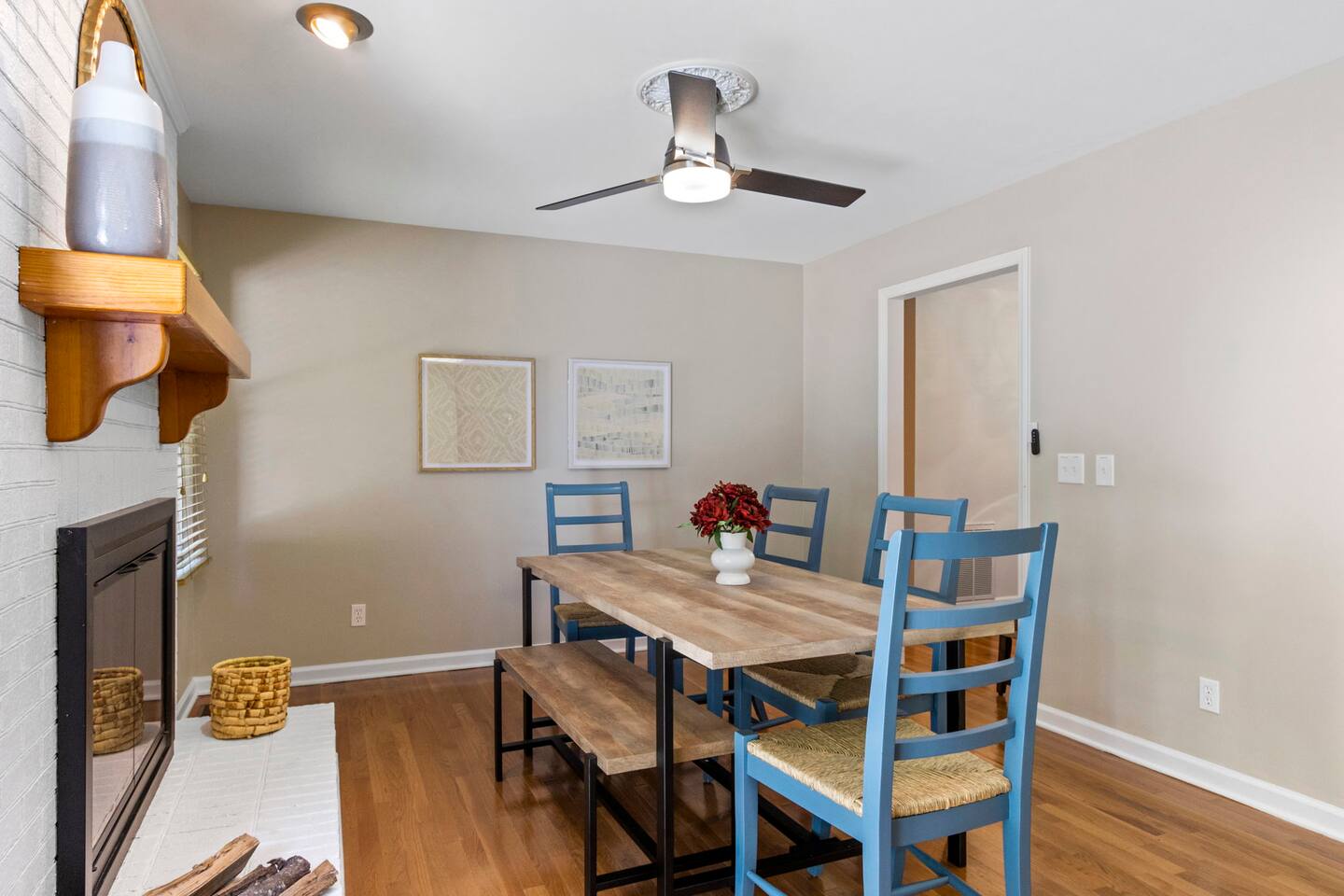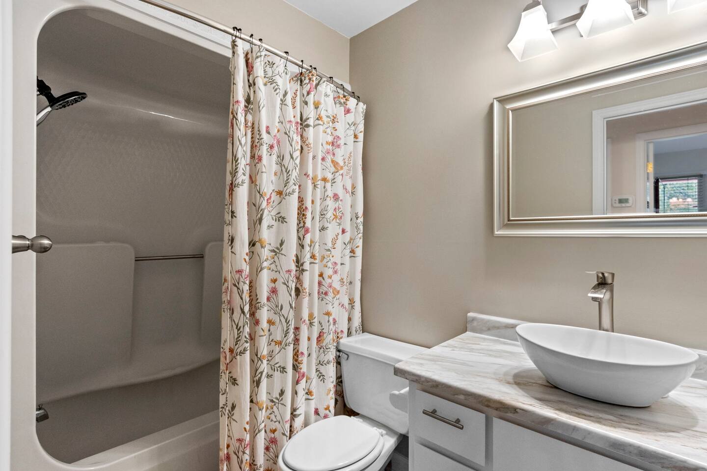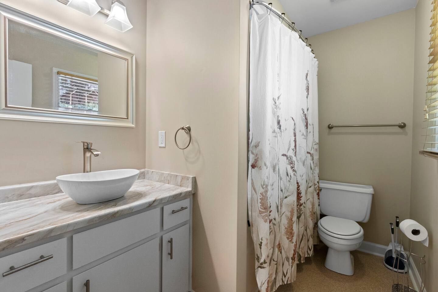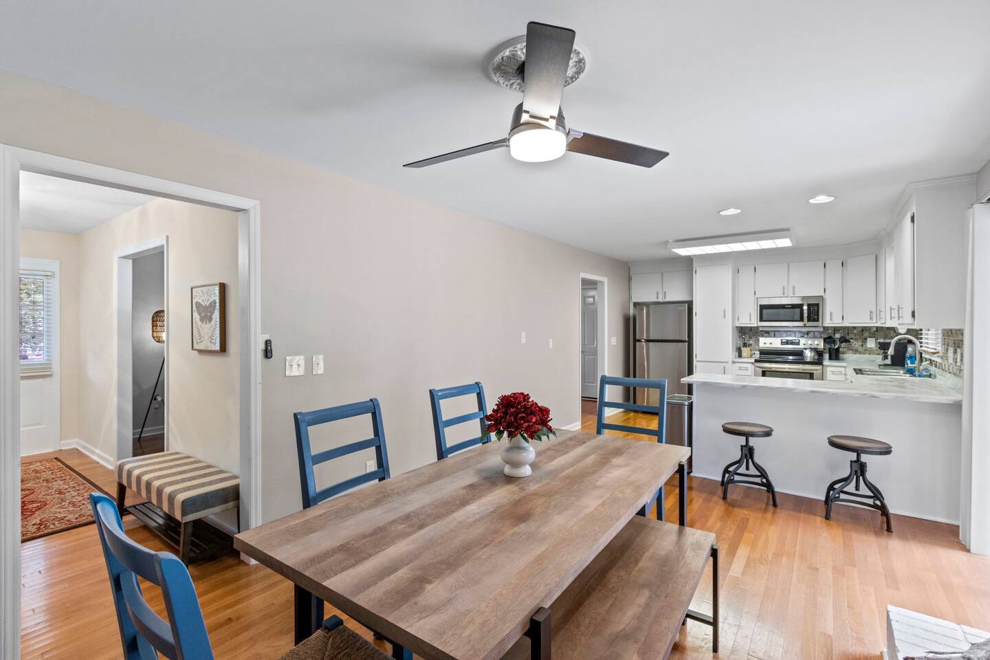 Located by a babbling brook and surrounded by the peaceful sounds of nature, Finch Landing is sure to charm those retreating to the upstate for their extended stay (30 days-6 month rental). With utilities included and pets welcome ($250 fee; $100 per additional pet), we make it easy for guests to move in and feel at home at our creekside cottage. Upon arrival at the property, guests will be greeted with mature trees, curated landscaping, and our picturesque creek- which includes a bridge for your enjoyment. Guests may use one space in the 2-car garage. Guests may enter the home either through the front door, with its spacious front porch, or through the garage door. Inside our home, you may relax in our spacious living room and play board games, talk with friends and family, or enjoy a tv show or movie (tv is Roku-enabled for guest accounts). Our living room boasts a brand new, comfortable sectional and a gorgeous desk and chair for a convenient work space for guests. Off the living room, guests may enter the kitchen, which is equipped with all you need to prepare a meal. The kitchen has plenty of counter space, with a peninsula area for prepping food. The kitchen flows smoothly into the dining area, which boasts a unique charm with its brick fireplace (The fireplace is not for guest use at this time). Our table includes a bench and four chairs and seats six individuals. Off the dining area and entryway is the main hallway, connecting the two bedrooms, hall bathroom, and laundry on each end. Our laundry room includes a brand new washer and dryer for guest use and has ample storage with a large row of cabinets. The queen bedroom includes comfortable bedding and two large closets for guest use. There is a second desk and chair in this bedroom to provide more working space for your convenience, and a nightstand and lamp. This bedroom also has a television for guests to enjoy at the end of a long day (Roku enabled for guest accounts). Along this hallway is the first bathroom, which includes modern new finishes, a single vanity, a toilet, and a tub/shower combination. Across the hallway is the master bedroom, which includes its own en-suite bathroom with a tub/shower combination, toilet, and single vanity with a sleek vessel sink. Guests may enjoy the comfort of resting in our plush king sized bed. This room includes two nightstands with accompanying lamps, a large closet, and a spacious dresser for storage. Atop the dresser is a second television, which is also equipped with Roku for guests to log into their accounts. One of the most unique aspects of this home is the beautiful outdoor space. Mature trees line the back of the house alongside the patio area, where you can enjoy watching the birds at our numerous feeders. This truly is a woodland oasis for you, your family, and your friends to enjoy. In the backyard is a locked white storage building, which guests may also use for their items as needed. Pets are welcome to join you with a fee of $250 for the first pet and $100 for each additional pet. All utilities are included in the rental price. We can't wait to welcome you home to Finch Landing.
