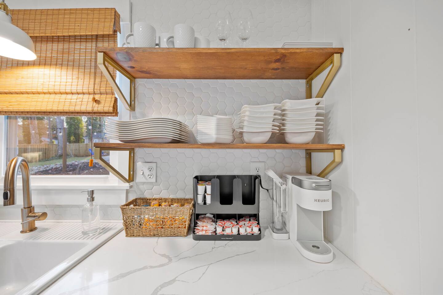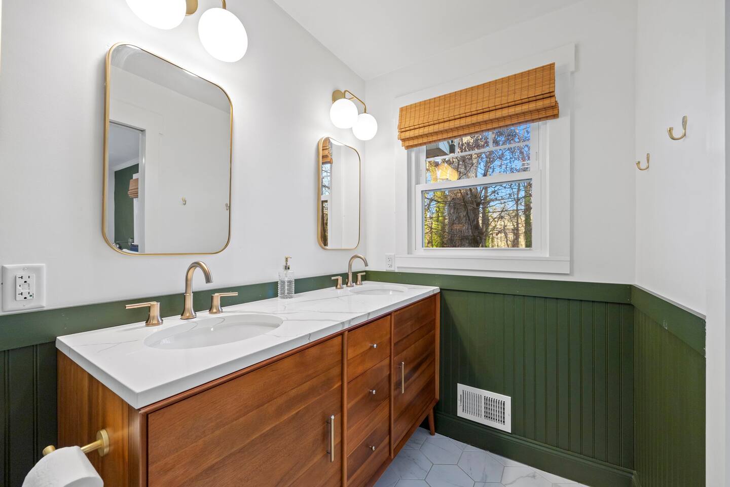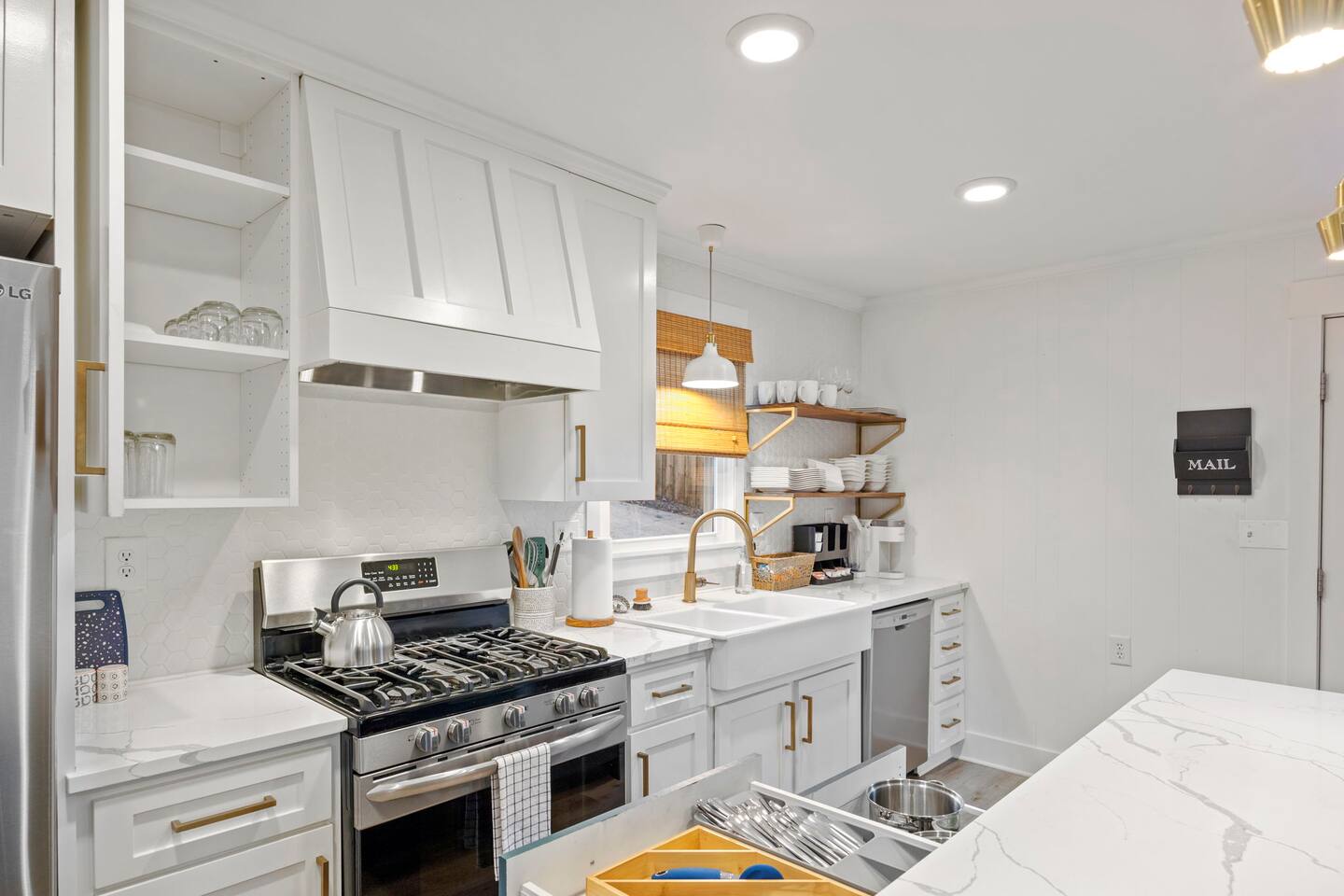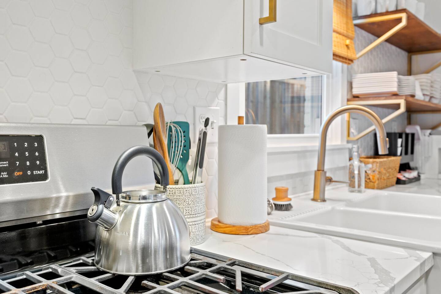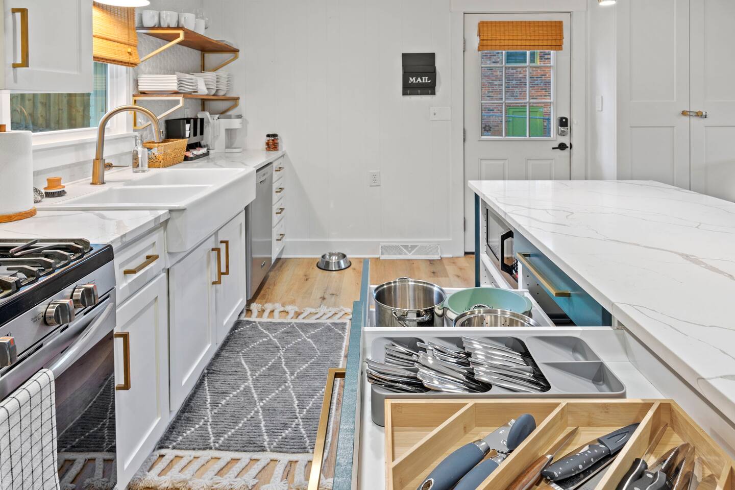 Welcome to Flora Sanctuary, your oasis just outside of Downtown Greenville. Our home is designed thoughtfully to provide an upscale experience for our guests. Our space is open and conducive for gathering with friends and family alike. Upon arriving at the home, guests may park in the spacious driveway. If you open the large rolling gate on the beautiful privacy fence, there is additional parking space. Guests receive a private, individualized code for self-check in at the front door. The entryway is open to the main living space of the house. The living room, dining space, and kitchen are open concept, providing lots of space to be together. ~The Living Area~ The living room's jewel is the beautiful accent wall with a whimsical wallpaper pattern, which was the inspiration for the name of the house. Rest and relax on the custom emerald green sofa or comfortable accent chair. Our television is a smart tv and allows guests to stream with their services (no cable). Our gas fireplace is usable with just the turn of a knob and allows for a cozy evening in. Kick your feet up and relax! ~Kitchen~ Just beside the living room is our fully updated kitchen space. The kitchen is fully stocked with all you need to cook a meal or bake. Our refrigerator, dishwasher, microwave, and oven are stainless steel. The view of the backyard out the window over the sink is delightful. Our coffee station includes a Keurig and complimentary k-cups, sugar, and creamer to start your stay off right. ~Dining Area~ The dining area is furnished with a table for 6. We include all place settings, cutlery, and glasses to set your table beautifully. Enjoy views of the backyard oasis out the large glass doors that lead to the patio. ~Patio and Backyard~ Our fully fenced backyard is perfect for gathering. The patio space includes an outdoor sectional and accent chairs for guests to enjoy. We include a propane grill and barbecue utensils for the perfect evening grilling out and enjoying the yard! Our backyard has a fire pit and Adirondack chairs to make s'mores or just enjoy time together. ~Laundry Room~ Back inside the house, just off the dining area is our laundry room. Tucked away with custom barn doors, our washer and dryer are both quiet and functional. We include detergent for our guests' use. Likewise, find an iron and ironing board to the side of the washing machine. ~Hall Bathroom~ Proceeding down the hallway, guests will find the hall bathroom, which is updated with gorgeous subway tile and gold fixtures. This bathroom includes a single vanity, toilet, and tub/shower combination. Each bathroom is stocked with fluffy towels and toiletries for our guests to use. ~Twin Bedroom~ The first bedroom down the hall is the twin bedroom, which is thoughtfully decorated and includes 2 twin beds. These beds are made with premium linens, and we include extra pillows and blankets for your comfort. Between the beds is a nightstand and lamp for additional lighting. We also offer USB chargers in all bedrooms for charging devices. ~Queen Bedroom~ Next, we have the queen bedroom. This room includes 1 queen-sized bed, sure to be comfortable for our guests. The bed is flanked by 2 nightstands with lamps, and the closet is spacious for storing luggage. The owners included a second smart tv in this bedroom for enjoying movies or shows at the end of the day. ~Master Suite~ Across the hall is the master suite, which is an oasis from the hustle and bustle of daily life. This bedroom includes large custom built-in wardrobe for easy storage. The king-sized bed is comfortable, and the hunter green accent wall gives a peaceful, natural aesthetic. We include nightstands with lamps for additional lighting, and this room boasts an en-suite bathroom. ~Master Bathroom~ Wow! The master bathroom is sure to impress. This fully updated bathroom can be compared to a spa experience. The shower includes multiple heads, a bench, toiletries, and a Bluetooth speaker! The double vanity has gorgeous countertops, and the decor is second to none. Relax and pamper yourself in this space! We can't wait to welcome you at Flora Sanctuary!