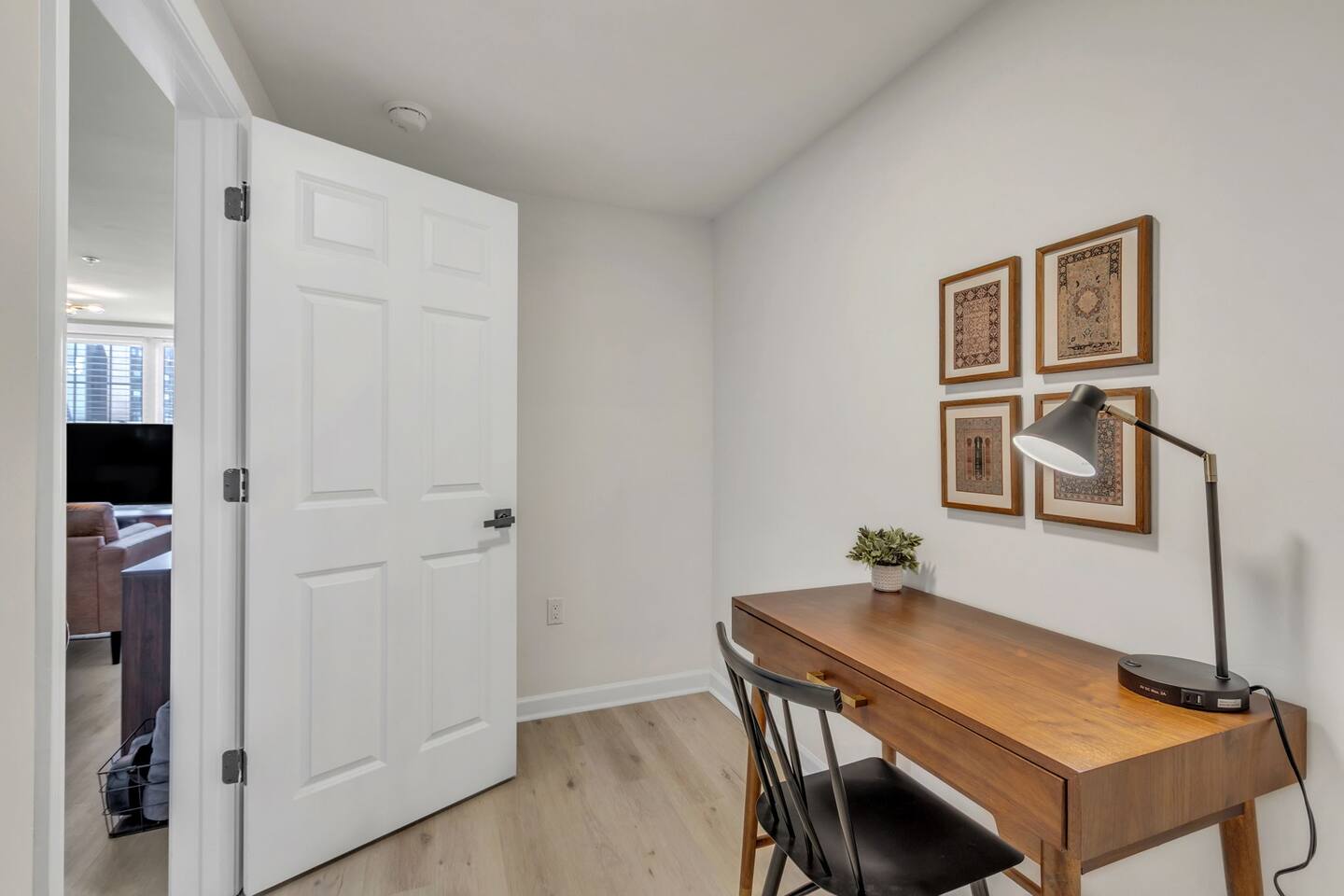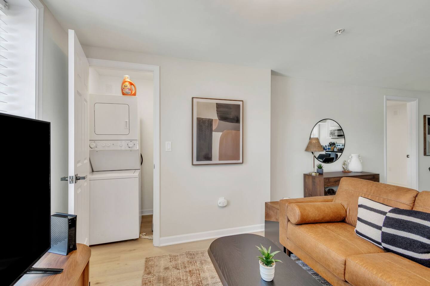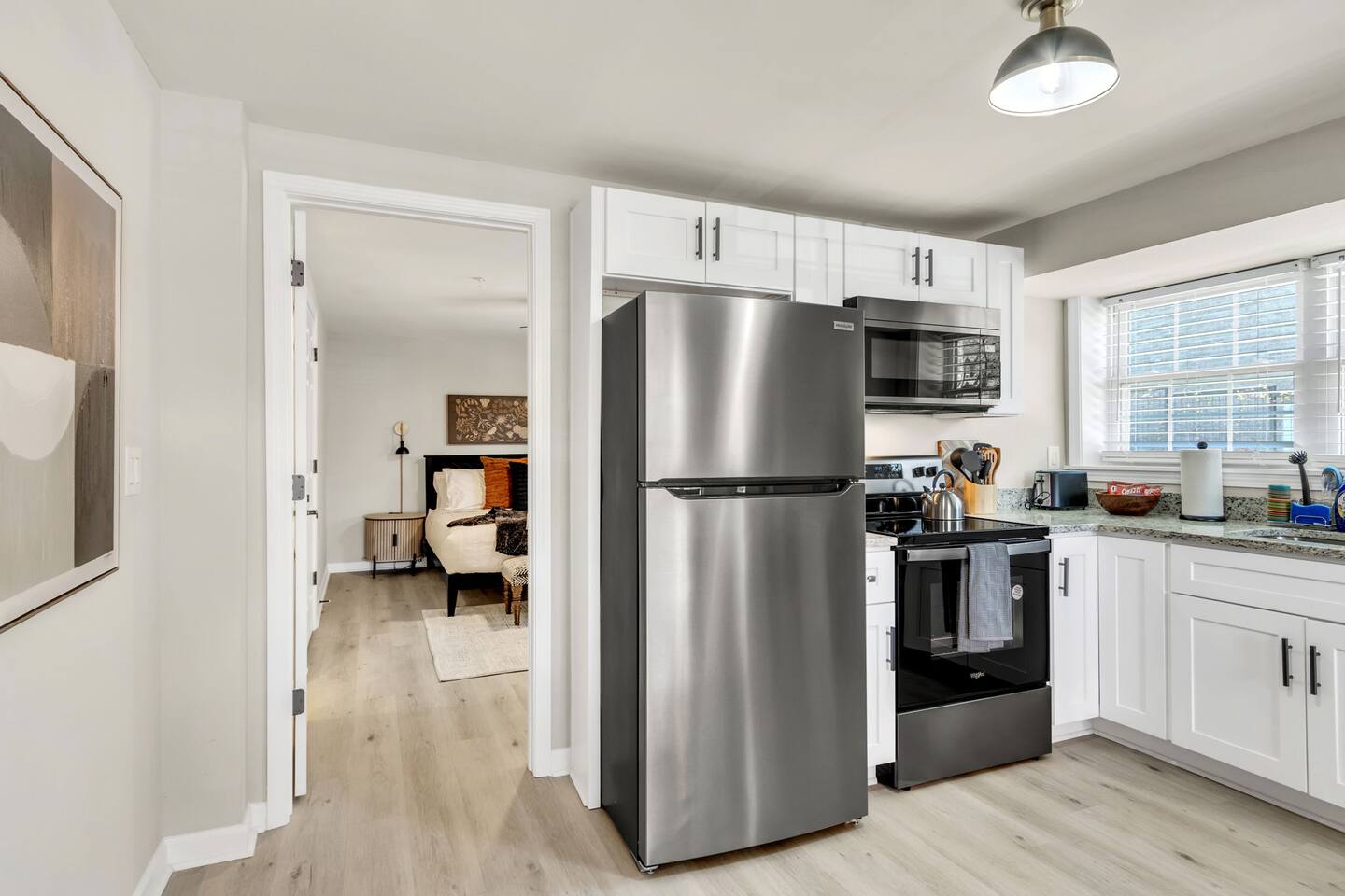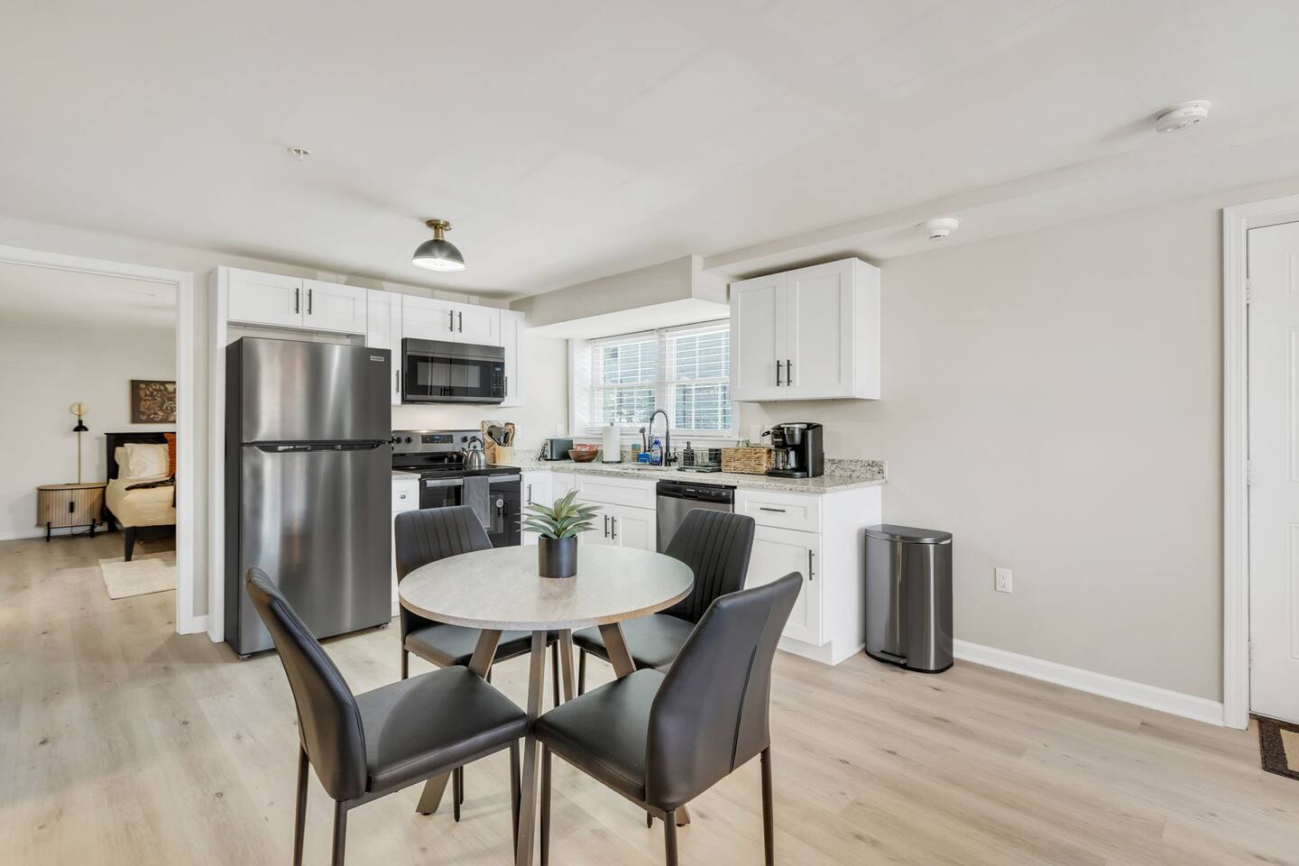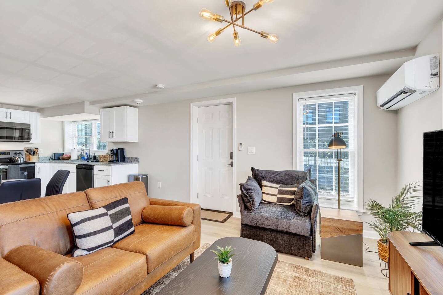 Welcome to Home Base @ West End—a perfect one-bedroom retreat just half a mile from Fluor Field and Falls Park and within walking distance to all the vibrant attractions in Downtown Greenville. This ground-level retreat offers both comfort and convenience for those looking to explore the city or enjoy a quiet stay. The living area features a cozy couch, a comfortable chair, and a 55-inch Smart TV (no cable, only streaming using your personal logins), perfect for relaxing after a busy day. The kitchen is fully equipped with all the essentials for cooking, including a dishwasher, stove, fridge, microwave, and a coffee station. A dining table for four is available for meals or planning your adventures. The modern laminate flooring throughout the unit creates a fresh and clean feel. The bedroom features a comfy king-sized bed, offering a restful night's sleep. The private bathroom is conveniently attached to the bedroom. For those needing to work, there's a separate office nook with a desk, ideal for getting some work done or catching up on emails. While there's no traditional closet, the unit provides freestanding clothing racks for storage. The space also includes a stackable washer and dryer for your convenience. For families, a pack-n-play is available for guests traveling with little ones, adding extra convenience for your stay. The home is equipped with a quiet, energy-efficient mini-split system in the main living area, providing year-round heating and cooling comfort. Fans are provided in the bedrooms for additional airflow. This unit is pet-friendly with a pet fee -- just add your furry friend as a guest to your itinerary. Free parking is available for one vehicle, though please note the parking area is a bit tight and requires a bit of maneuvering, so guests should be comfortable with backing up. The location is unbeatable, with Fluor Field, Brick St. Cafe, and Falls Park all within walking distance. Whether you're here for a ballgame or to explore the local attractions, Home Base @ West End offers the perfect spot to relax and recharge.