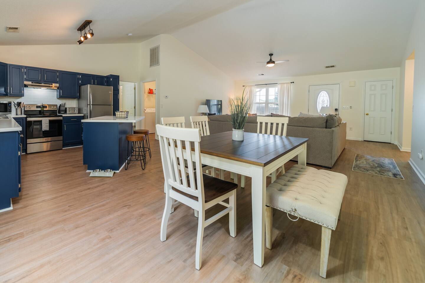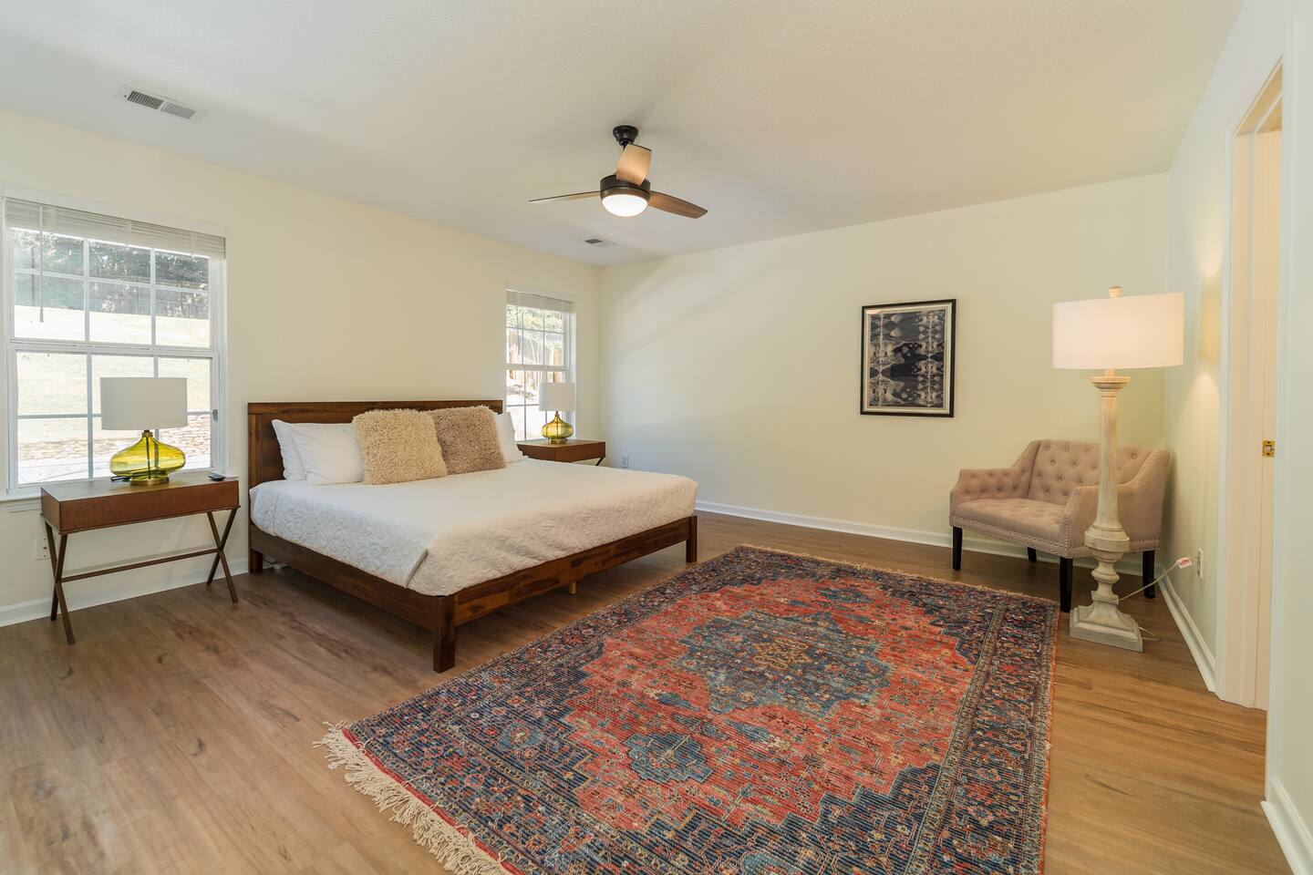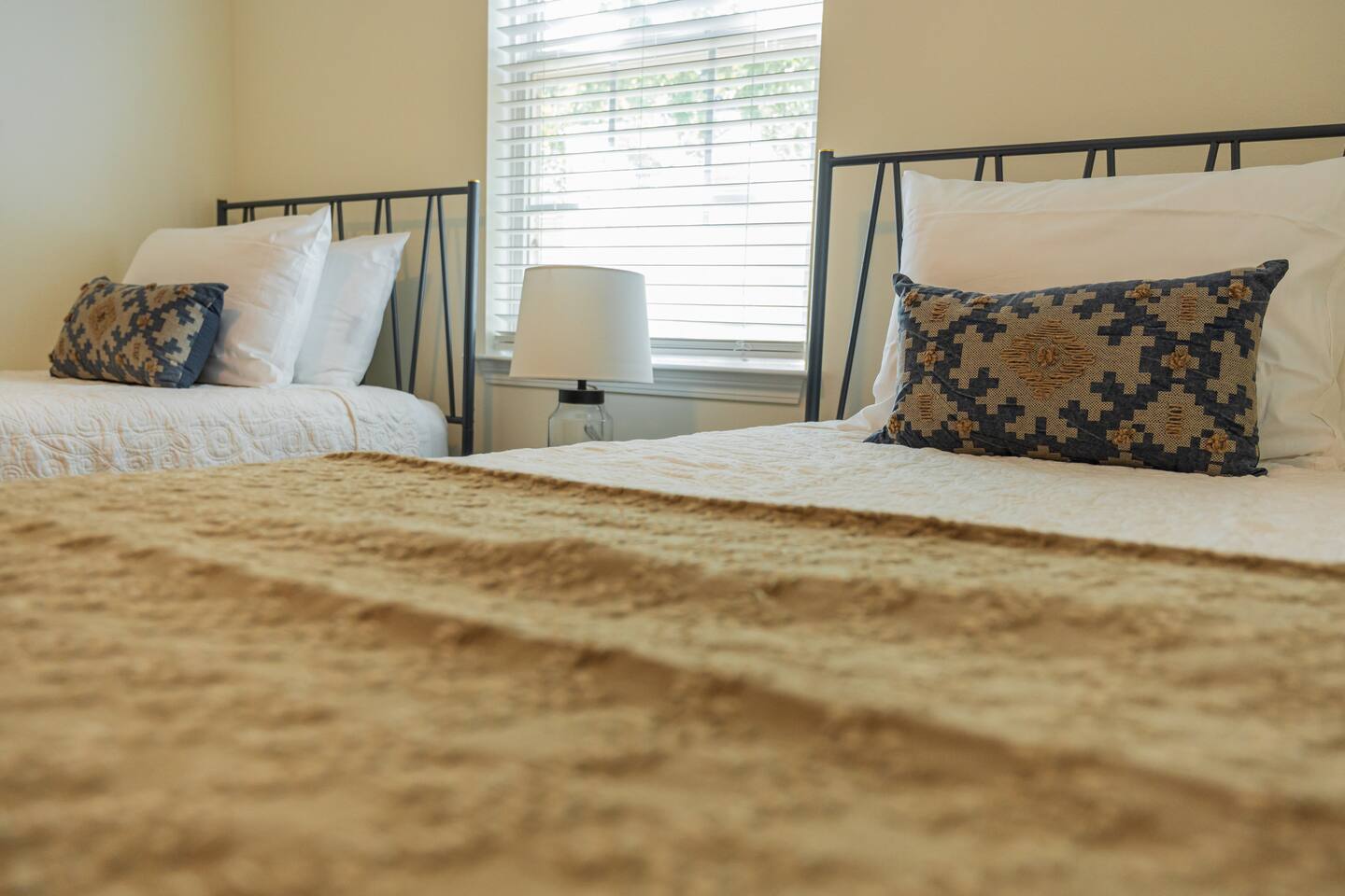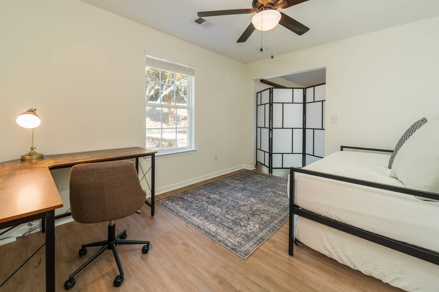 Welcome to Paris Mountain Pool House! We can't wait to welcome you into our home. Upon arriving, guests can park in our driveway, or in our 2 car garage (must be opened from the inside). Our front door is equipped with a smart lock for easy, keyless entry. Once inside, you will be in our open living area, complete with a large, cozy sectional sofa, bench seating, and Smart TV (guests can log in to their streaming services. No cable). Off to the corner is a beautiful kitchen with stainless-steel appliances and all you will need to whip up a great meal. Our dining room table seats 6, with 4 chairs and an upholstered bench. There is also additional bar seating for two at the kitchen island. Surrounding the living space are our bedrooms, with the Master on its own end of the house, and the other three taking up the opposite side. The Master Bedroom is spacious and lush, featuring a King Bed, large side tables and reading lamps, a reading nook, TV (guests can login to their own streaming services, no cable), and an en suite bathroom featuring a tub/shower combination, toilet, and single vanity. At the front corner of the home is our second bedroom, the King bedroom. This bedroom features a King bed, small side tables, above bed reading lights, dresser, and closet. Next door to this room is our hall bath, featuring a large single vanity, toilet, and tub/shower combination. Next door is the twin room, featuring two twin beds and fun decor such as a trunk as a nightstand, butterfly art, and a vintage globe. At the back corner of the house is our 4th bedroom/office. This room has a screen to function as a door for privacy and has a day bed (twin sized) with a trundle that pulls out from underneath. It also features its own closet and a corner desk with a lamp and a chair for those who have work to get done. Guests traveling with small children should note that we have a pack and play and highchair provided for your use. Finally, we have our beautiful fenced in backyard, complete with a custom pool. The salt water pool is open year-round, but is not fully heated-- please use at your own discretion. Also, this pool features multiple levels, with seating areas, a step-down, step up, and then a more abrupt deep end. It is not a standard slanted pool. In addition to the pool, we have a covered swing, high top seating for 4, and a gas grill for your use. * Pets are welcome in our home with a one-time fee, automatically applied when you add your pet as a guest during booking We know you'll love our home as much as we do, and we can't wait to have you!