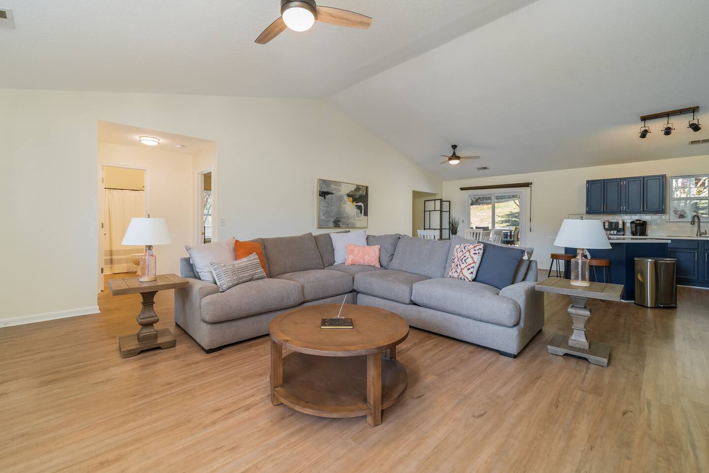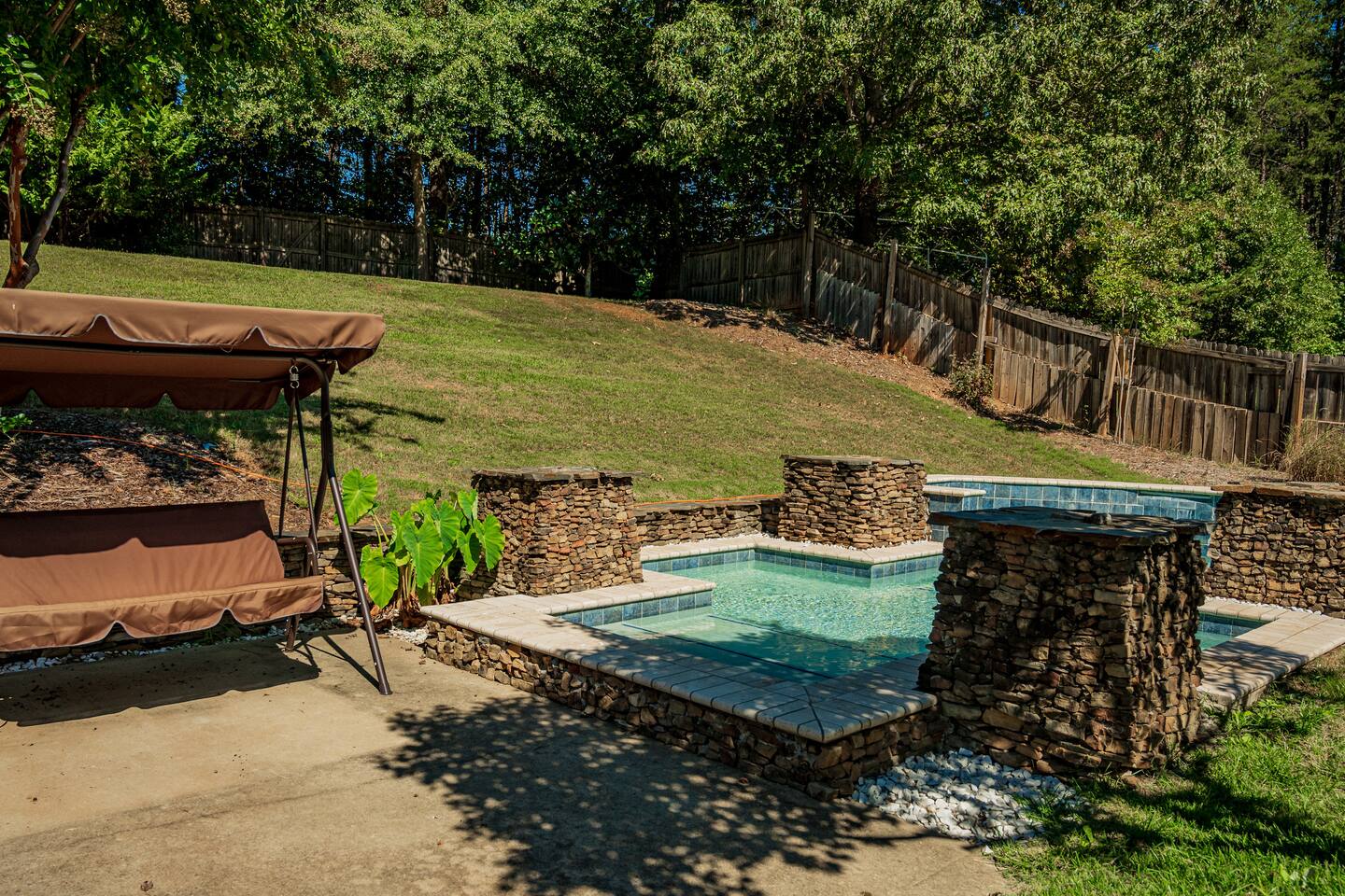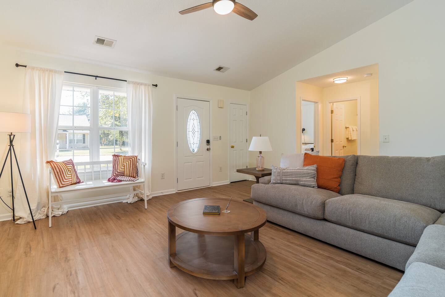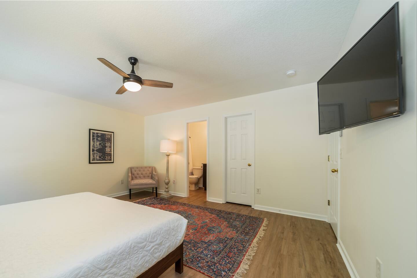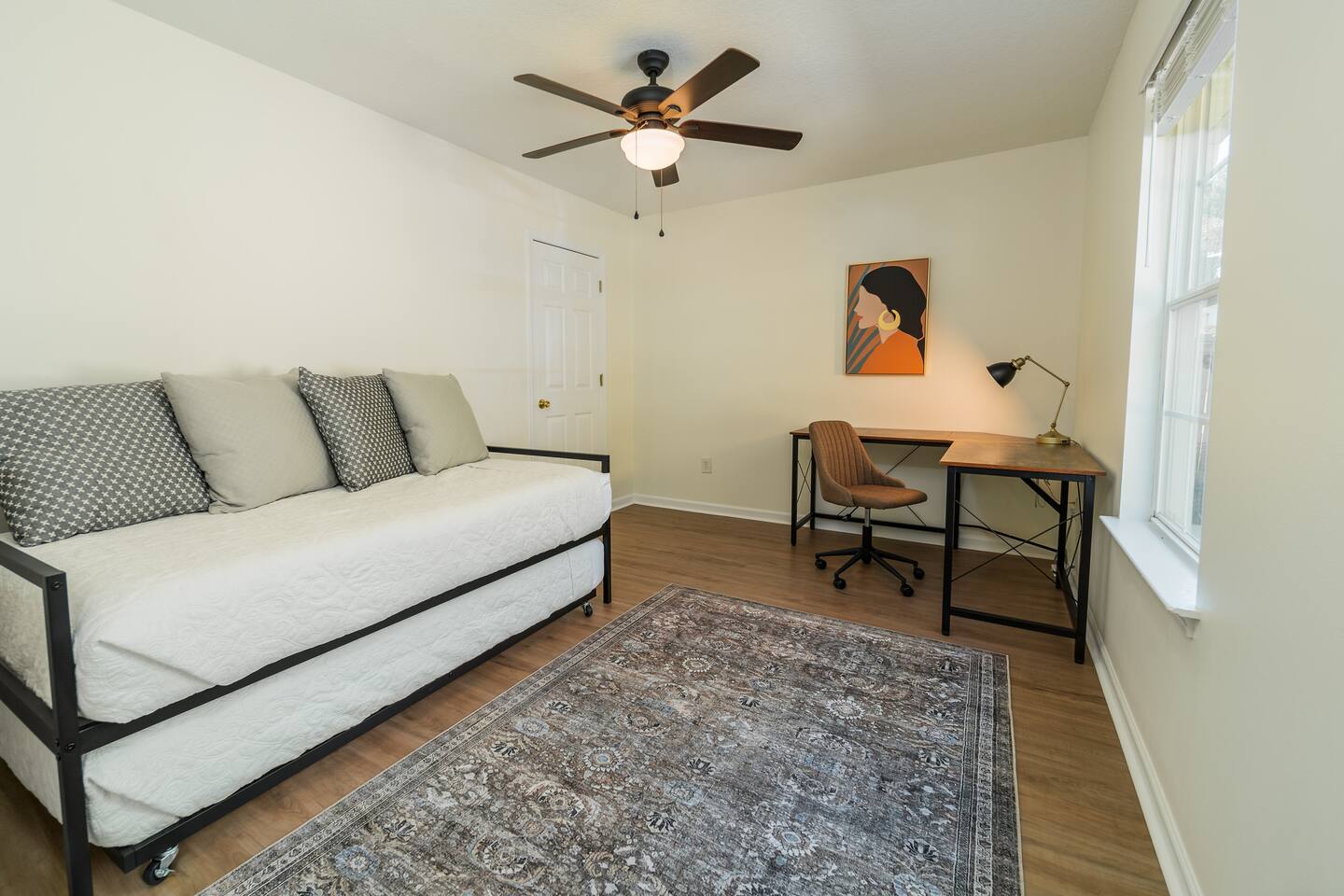 Welcome to Paris Mountain Pool House! We can't wait to welcome you into our home. Upon arriving, guests can park in our driveway, or in our 2 car garage (must be opened from the inside). Our front door is equipped with a smart lock for easy, keyless entry. Once inside, you will be in our open living area, complete with a large, cozy sectional sofa, bench seating, and Smart TV (guests can log in to their streaming services. No cable). Off to the corner is a beautiful kitchen with stainless-steel appliances and all you will need to whip up a great meal. Our dining room table seats 6, with 4 chairs and an upholstered bench. There is also additional bar seating for two at the kitchen island. Surrounding the living space are our bedrooms, with the Master on its own end of the house, and the other three taking up the opposite side. The Master Bedroom is spacious and lush, featuring a King Bed, large side tables and reading lamps, a reading nook, TV (guests can login to their own streaming services, no cable), and an en suite bathroom featuring a tub/shower combination, toilet, and single vanity. At the front corner of the home is our second bedroom, the King bedroom. This bedroom features a King bed, small side tables, above bed reading lights, dresser, and closet. Next door to this room is our hall bath, featuring a large single vanity, toilet, and tub/shower combination. Next door is the twin room, featuring two twin beds and fun decor such as a trunk as a nightstand, butterfly art, and a vintage globe. At the back corner of the house is our 4th bedroom/office. This room has a screen to function as a door for privacy and has a day bed (twin sized) with a trundle that pulls out from underneath. It also features its own closet and a corner desk with a lamp and a chair for those who have work to get done. Guests traveling with small children should note that we have a pack and play and highchair provided for your use. Finally, we have our beautiful fenced in backyard, complete with a custom pool. The salt water pool is open year-round, but is not fully heated-- please use at your own discretion. Also, this pool features multiple levels, with seating areas, a step-down, step up, and then a more abrupt deep end. It is not a standard slanted pool. In addition to the pool, we have a covered swing, high top seating for 4, and a gas grill for your use. * Pets are welcome in our home with a one-time fee, automatically applied when you add your pet as a guest during booking We know you'll love our home as much as we do, and we can't wait to have you!