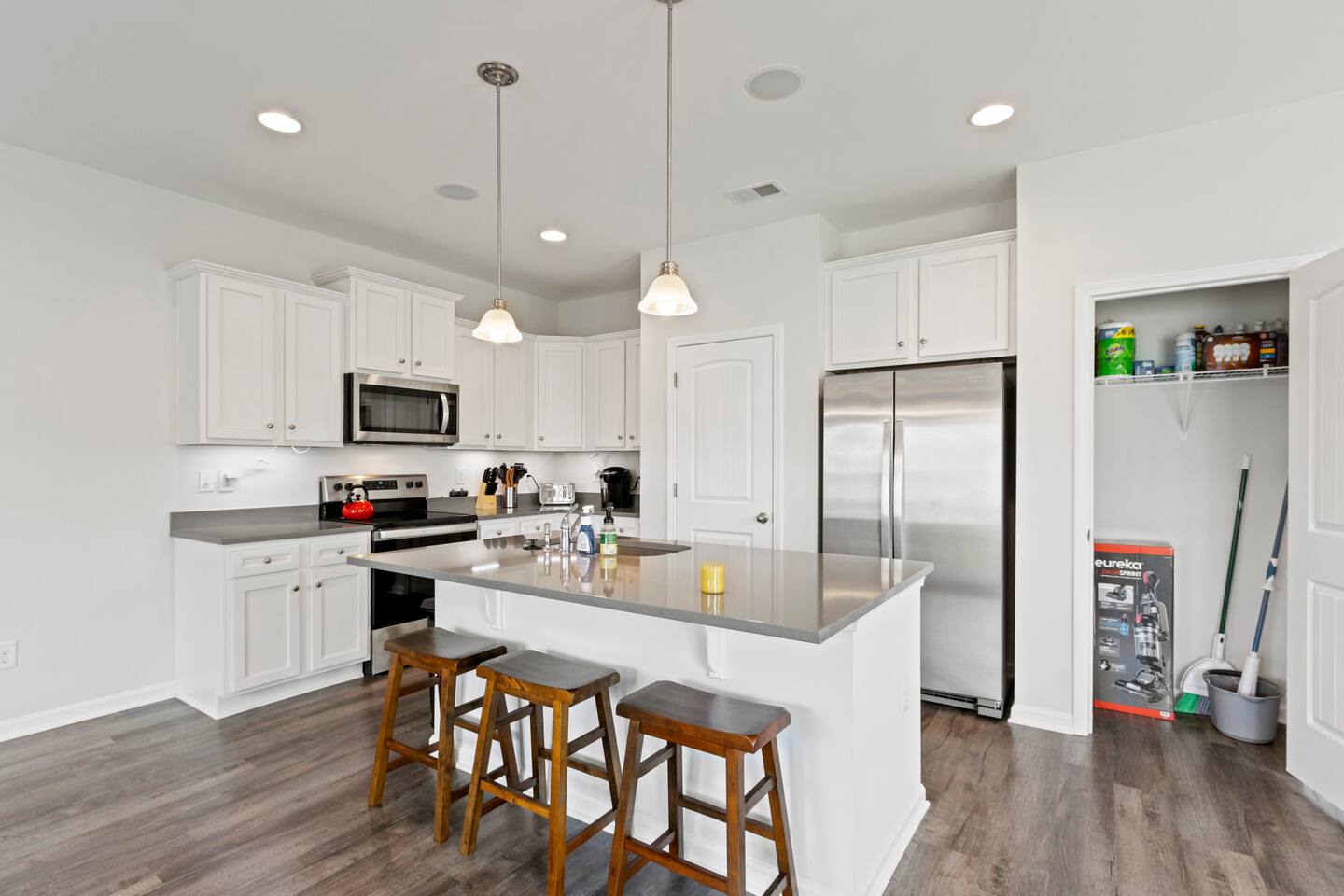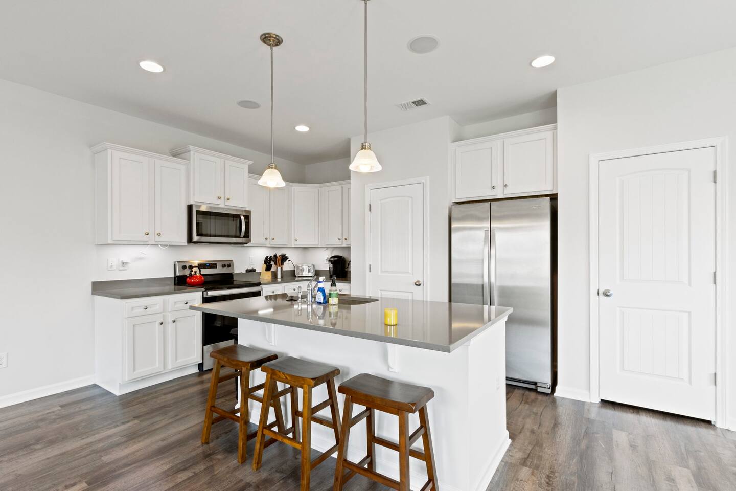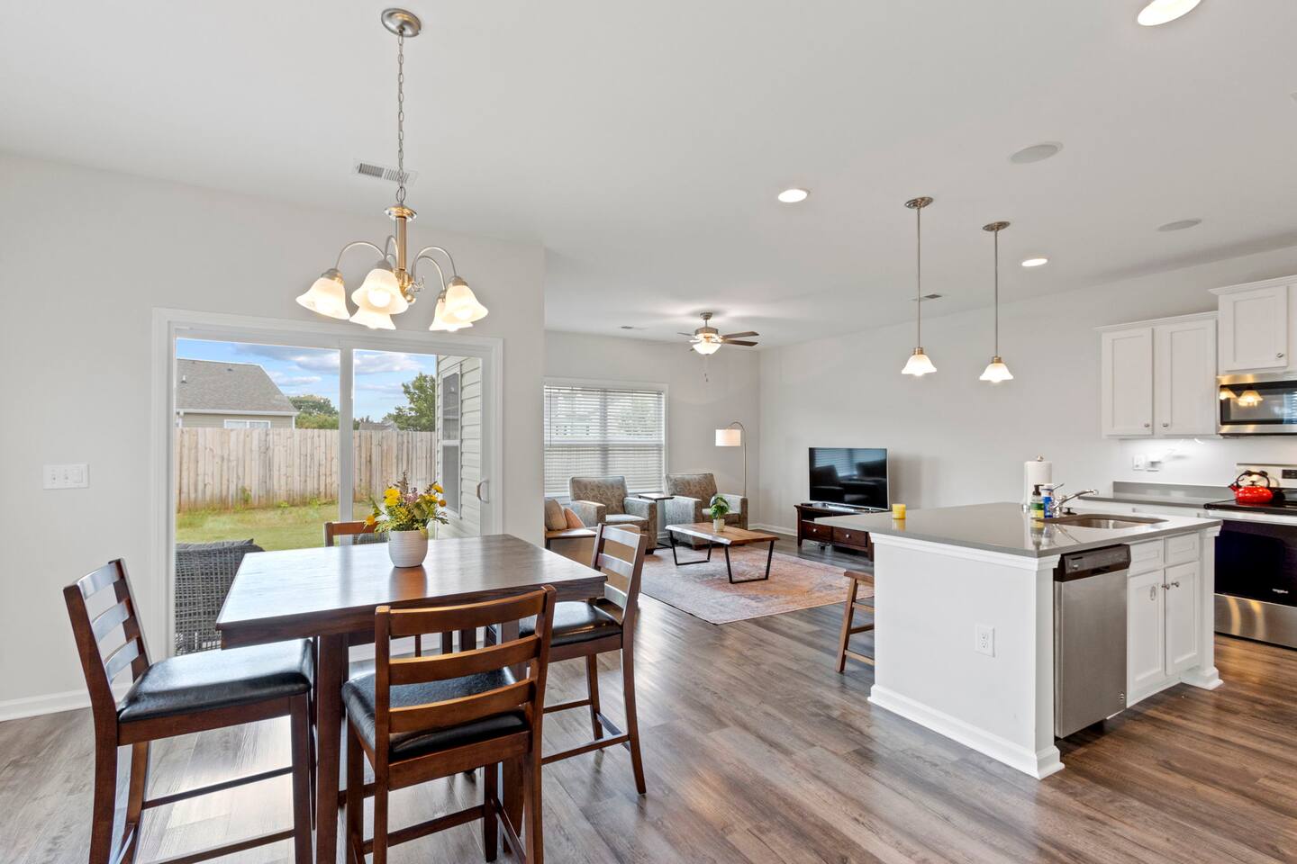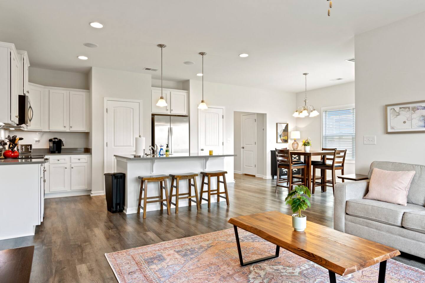 Welcome to Park Place Townes, a fully furnished townhome with 3 bedrooms, 2.5 bathrooms, and a 2 car garage. Our home is pet friendly with a fee ($250 for first pet, $100 for each additional pet-requested after booking) and utilities are included in the rental price. Upon arriving at the townhome, guests may park their cars in the driveway or the 2-car garage. Entry is available through the garage or the front door, and guests will receive their private entry code upon booking. Downstairs, you will walk through the spacious entryway and find the half bathroom immediately off this hallway. Our dining table offers seating for four, and there are 3 barstools at the large kitchen island for additional seating. The living room is beautifully decorated and the sofa and 2 armchairs offer a comfortable place for guests to relax after a long day. The television is equipped with Roku for guests to stream using their personal accounts. Our large kitchen features an island, stove, refrigerator, microwave, dishwasher, pots and pans, plates, cups, mugs, wine glasses, a toaster, a Keurig coffee maker, and so much more-- you should find everything you need to whip up a lovely meal. Upstairs, guests will find the laundry room equipped with both a washer and dryer, all three bedrooms, and the two full bathrooms. The twin bedroom has both a twin bed and a dedicated office space where guests can comfortably work at home. It also includes a closet, nightstand, and a lamp. Next to this bedroom, you will find the queen bedroom, which is also equipped with a full closet, 2 nightstands, and accompanying lamps. These bedrooms share the hallway bathroom, which has a single vanity and tub/shower combination. At the end of this hallway is the spacious and comfortable master suite. This bedroom has an en-suite bathroom with a step-in shower, toilet room, and double vanity. The master bedroom has a king bed, large dresser, walk-in closet, dresser, and 2 nightstands with lamps. Reach out to the hosts for a link to our matterport, which allows you to truly experience our space from wherever you are. Outside, guests can enjoy the small patio area, which includes 2 outdoor chairs. We can't wait to host you at your home away from home at Park Place Townes!
