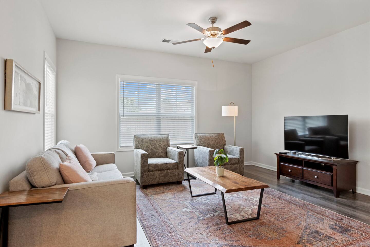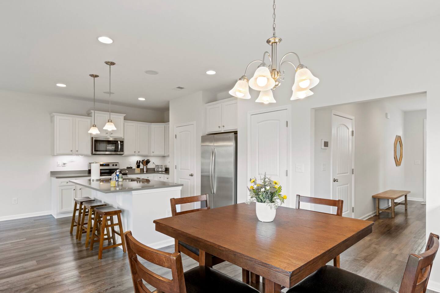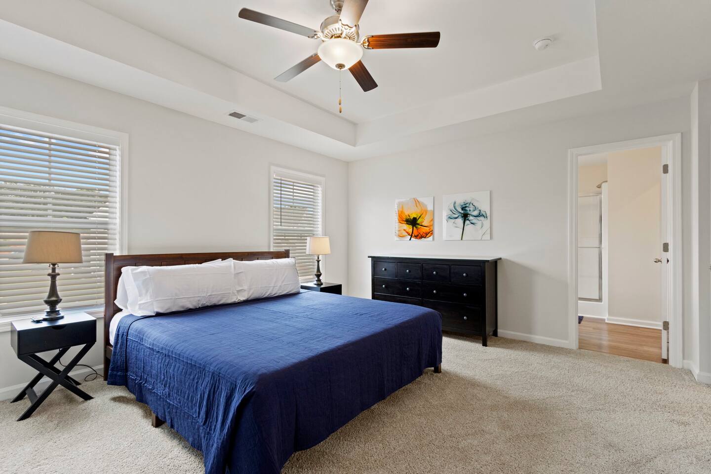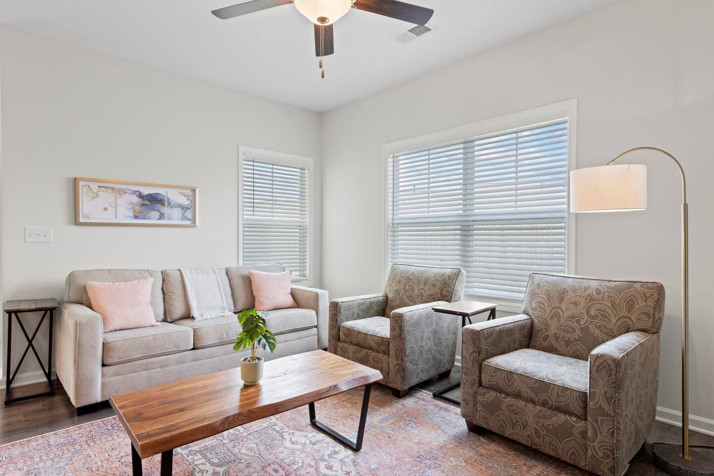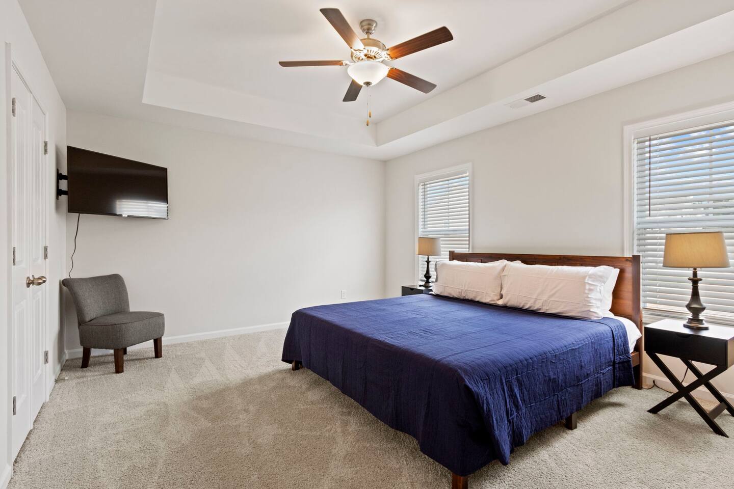 Welcome to Park Place Townes, a fully furnished townhome with 3 bedrooms, 2.5 bathrooms, and a 2 car garage. Our home is pet friendly with a fee ($250 for first pet, $100 for each additional pet-requested after booking) and utilities are included in the rental price. Upon arriving at the townhome, guests may park their cars in the driveway or the 2-car garage. Entry is available through the garage or the front door, and guests will receive their private entry code upon booking. Downstairs, you will walk through the spacious entryway and find the half bathroom immediately off this hallway. Our dining table offers seating for four, and there are 3 barstools at the large kitchen island for additional seating. The living room is beautifully decorated and the sofa and 2 armchairs offer a comfortable place for guests to relax after a long day. The television is equipped with Roku for guests to stream using their personal accounts. Our large kitchen features an island, stove, refrigerator, microwave, dishwasher, pots and pans, plates, cups, mugs, wine glasses, a toaster, a Keurig coffee maker, and so much more-- you should find everything you need to whip up a lovely meal. Upstairs, guests will find the laundry room equipped with both a washer and dryer, all three bedrooms, and the two full bathrooms. The twin bedroom has both a twin bed and a dedicated office space where guests can comfortably work at home. It also includes a closet, nightstand, and a lamp. Next to this bedroom, you will find the queen bedroom, which is also equipped with a full closet, 2 nightstands, and accompanying lamps. These bedrooms share the hallway bathroom, which has a single vanity and tub/shower combination. At the end of this hallway is the spacious and comfortable master suite. This bedroom has an en-suite bathroom with a step-in shower, toilet room, and double vanity. The master bedroom has a king bed, large dresser, walk-in closet, dresser, and 2 nightstands with lamps. Reach out to the hosts for a link to our matterport, which allows you to truly experience our space from wherever you are. Outside, guests can enjoy the small patio area, which includes 2 outdoor chairs. We can't wait to host you at your home away from home at Park Place Townes!