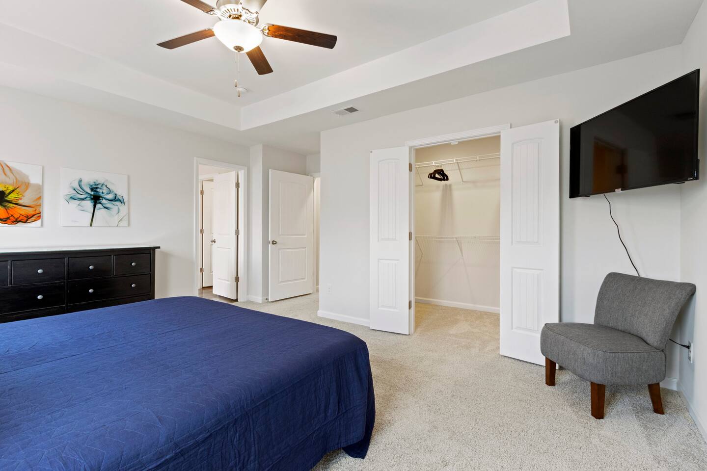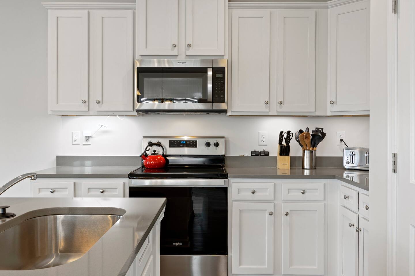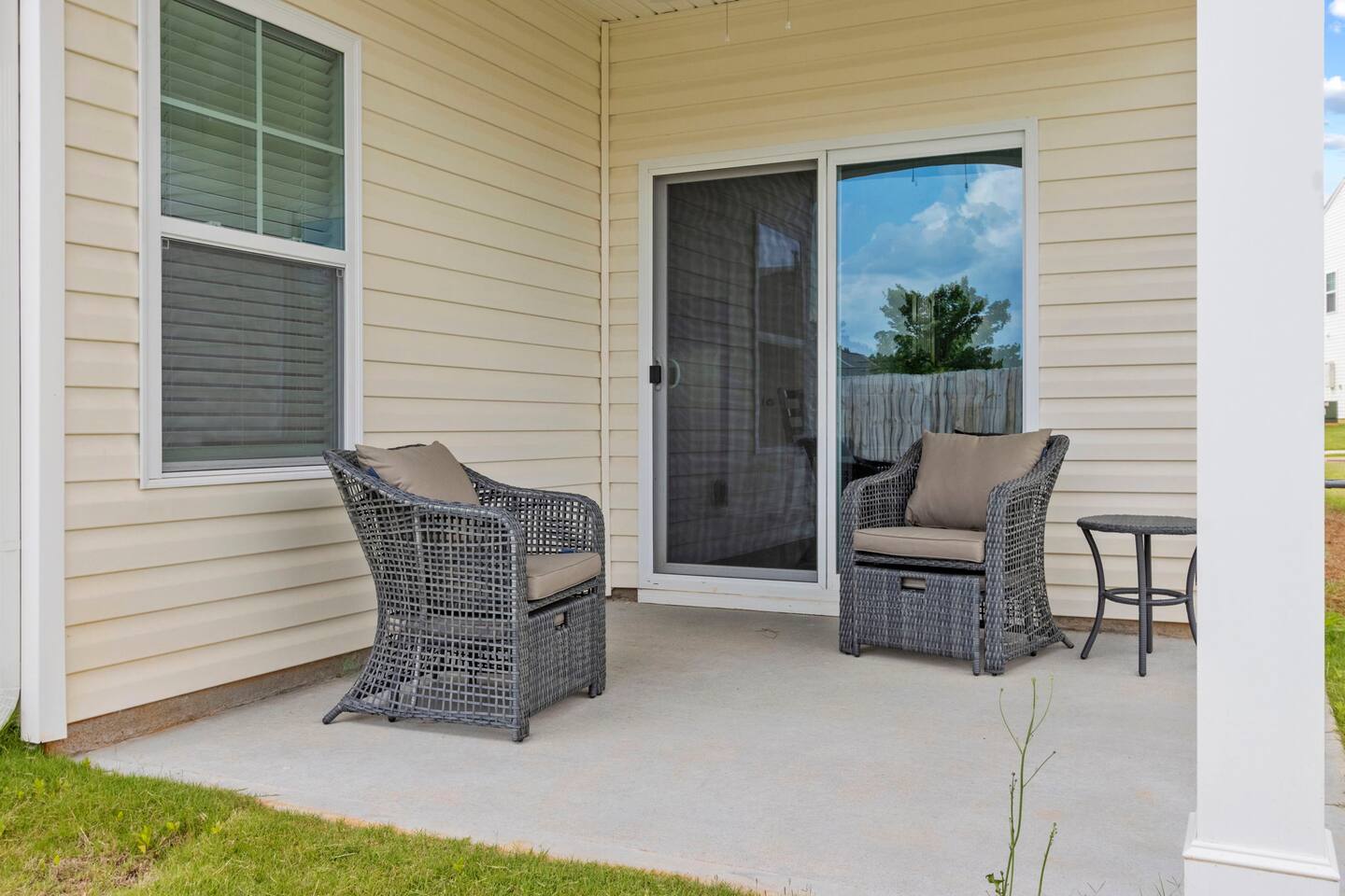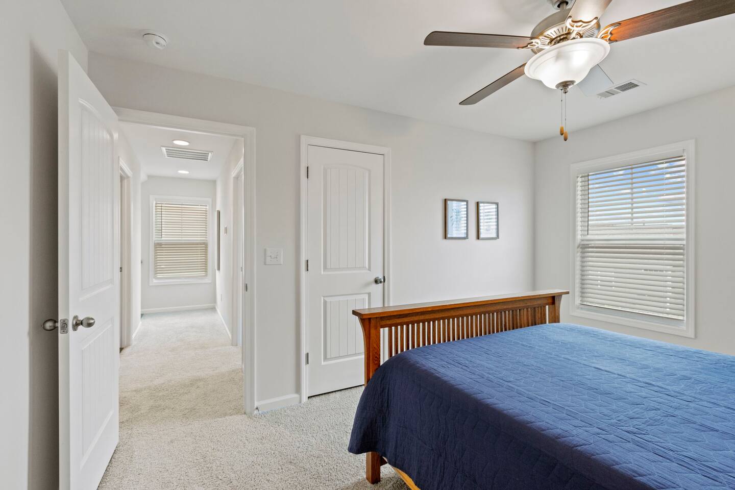 Welcome to Park Place Townes, a fully furnished townhome with 3 bedrooms, 2.5 bathrooms, and a 2 car garage. Our home is pet friendly with a fee ($250 for first pet, $100 for each additional pet-requested after booking) and utilities are included in the rental price. Upon arriving at the townhome, guests may park their cars in the driveway or the 2-car garage. Entry is available through the garage or the front door, and guests will receive their private entry code upon booking. Downstairs, you will walk through the spacious entryway and find the half bathroom immediately off this hallway. Our dining table offers seating for four, and there are 3 barstools at the large kitchen island for additional seating. The living room is beautifully decorated and the sofa and 2 armchairs offer a comfortable place for guests to relax after a long day. The television is equipped with Roku for guests to stream using their personal accounts. Our large kitchen features an island, stove, refrigerator, microwave, dishwasher, pots and pans, plates, cups, mugs, wine glasses, a toaster, a Keurig coffee maker, and so much more-- you should find everything you need to whip up a lovely meal. Upstairs, guests will find the laundry room equipped with both a washer and dryer, all three bedrooms, and the two full bathrooms. The twin bedroom has both a twin bed and a dedicated office space where guests can comfortably work at home. It also includes a closet, nightstand, and a lamp. Next to this bedroom, you will find the queen bedroom, which is also equipped with a full closet, 2 nightstands, and accompanying lamps. These bedrooms share the hallway bathroom, which has a single vanity and tub/shower combination. At the end of this hallway is the spacious and comfortable master suite. This bedroom has an en-suite bathroom with a step-in shower, toilet room, and double vanity. The master bedroom has a king bed, large dresser, walk-in closet, dresser, and 2 nightstands with lamps. Reach out to the hosts for a link to our matterport, which allows you to truly experience our space from wherever you are. Outside, guests can enjoy the small patio area, which includes 2 outdoor chairs. We can't wait to host you at your home away from home at Park Place Townes!