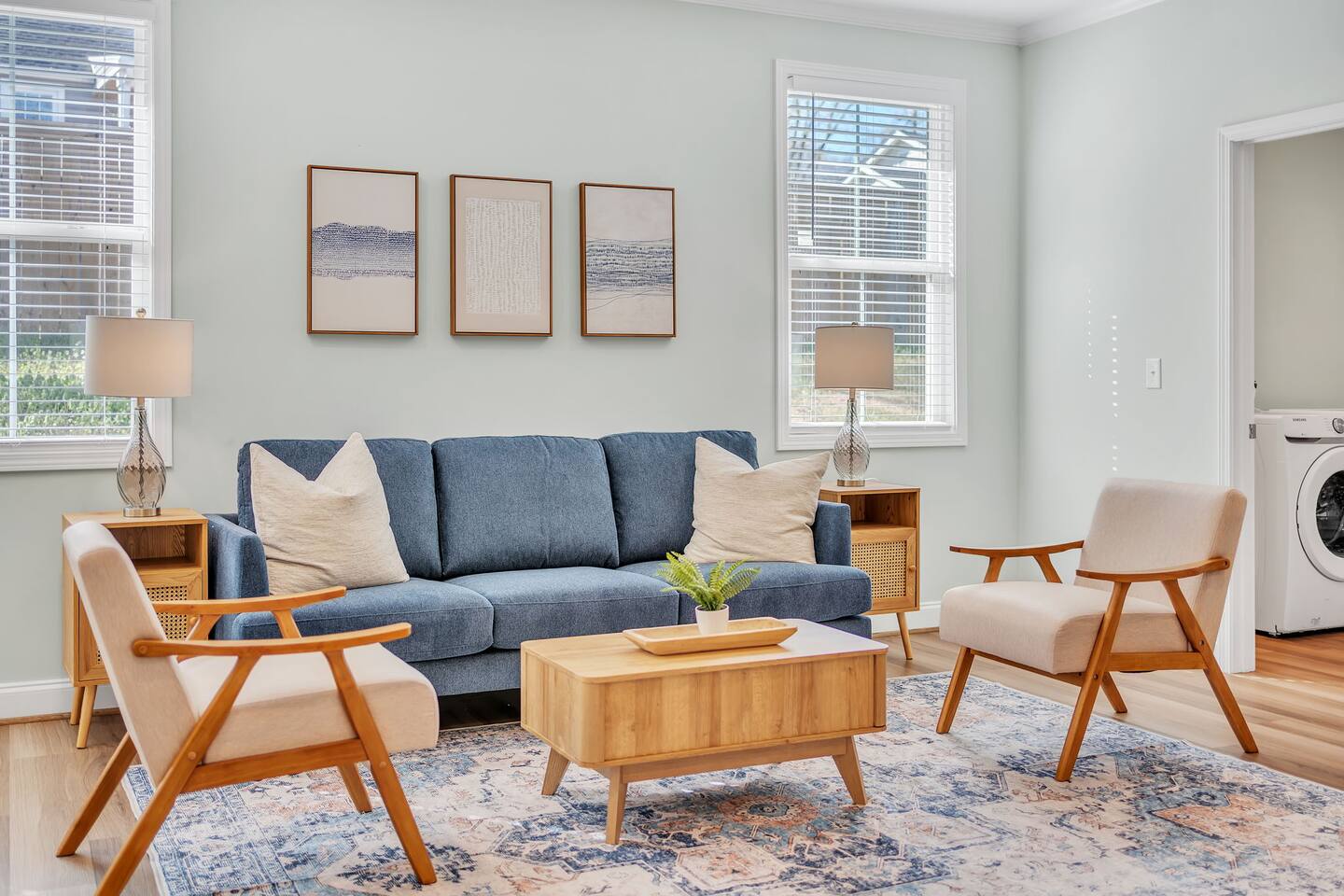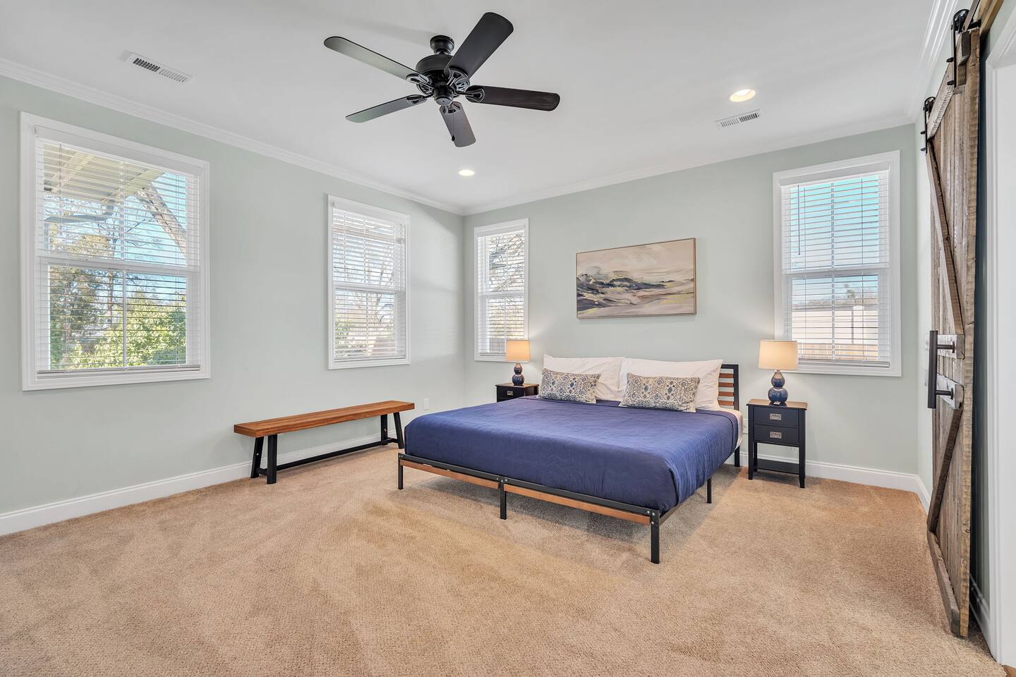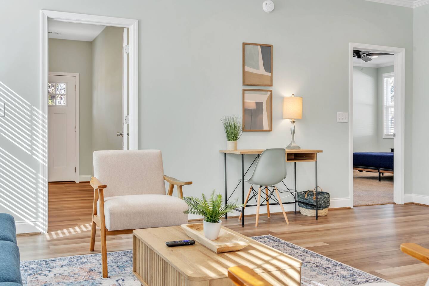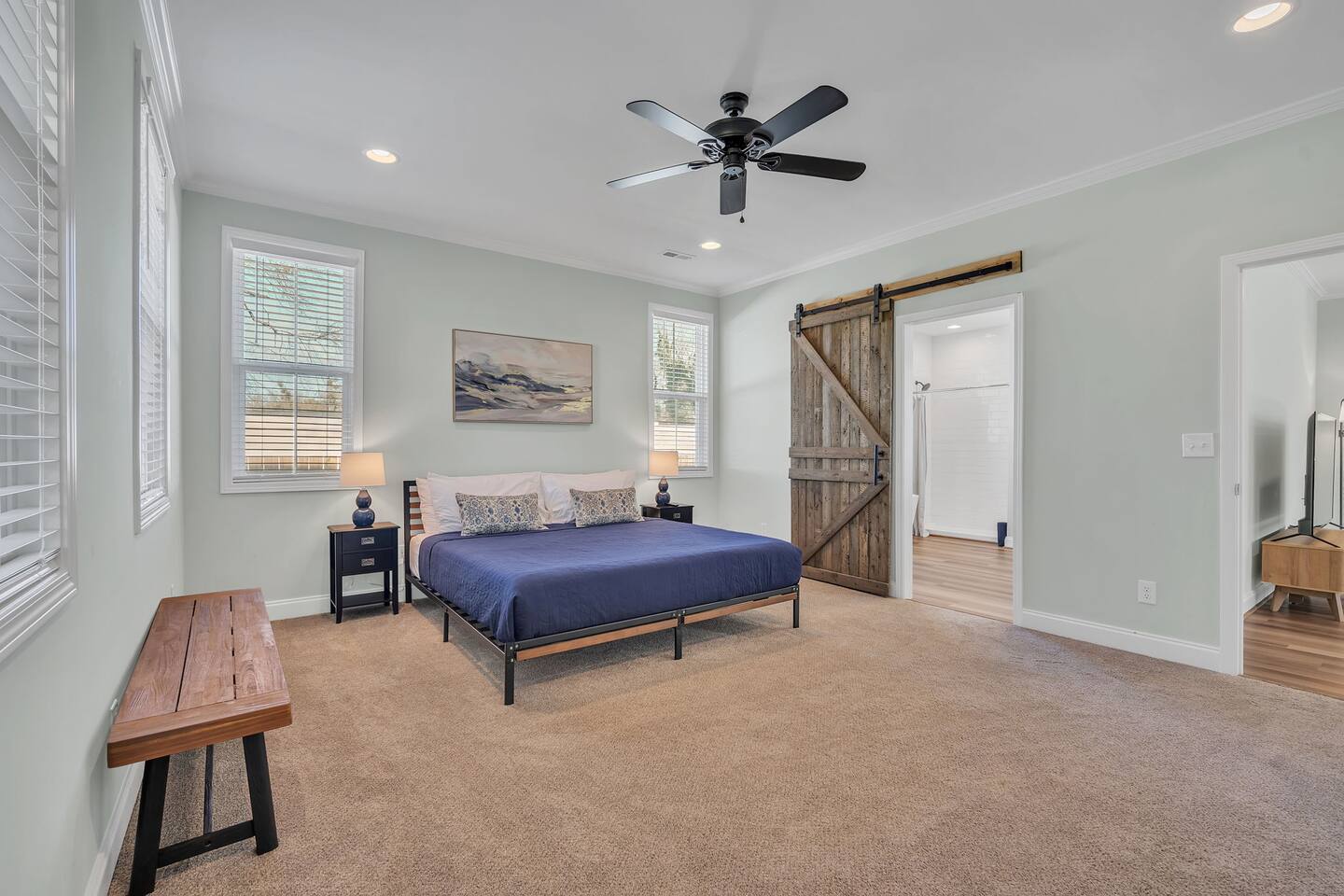 Welcome to Blue Ridge Cottage- your home away from home in the charming small town of Greer, SC! Upon arrival, guests may park in the driveway. Our charming rocking chair front porch is the perfect spot to sit and enjoy nature. We offer convenient self-check in with personalized entry codes for each guest. Once inside, guests will feel welcomed by our open concept living space. Our peaceful, elegant decor is comfortable and curated with our guests in mind. The living space includes a couch, 2 accent chairs, and a smart tv with Roku for your streaming services. The dining table includes seating for 6, and is conveniently located by the newly updated kitchen. Our kitchen is fully stocked with all you need to prepare meals or bake with family and friends. We have a Keurig coffee station with complimentary amenities to kick off your stay. At the front of the house is the twin bedroom, which includes 2 twin beds with premium linens for your enjoyment. This room includes a closet for storage. The hall bathroom includes a tub/shower combination, single vanity, and toilet. We include fluffy towels and complimentary toiletries for your use. The second bedroom has a queen sized bed and closet. At the back of the house and tucked away is the primary suite, which includes an en-suite bathroom and walk-in closet. This room is staged with a king-sized bed and smart tv for your streaming services. Our bathroom is extremely spacious and has a double vanity, toilet, large tub, and walk-in shower. Our laundry room has a washer and dryer, iron/ironing board, and complimentary detergent. * Pets are welcome in our home with a one-time fee, automatically applied when you add your pet as a guest during booking Our back porch includes patio chairs and is the perfect spot to enjoy the peaceful surroundings. We can't wait to have you at Blue Ridge Cottage!