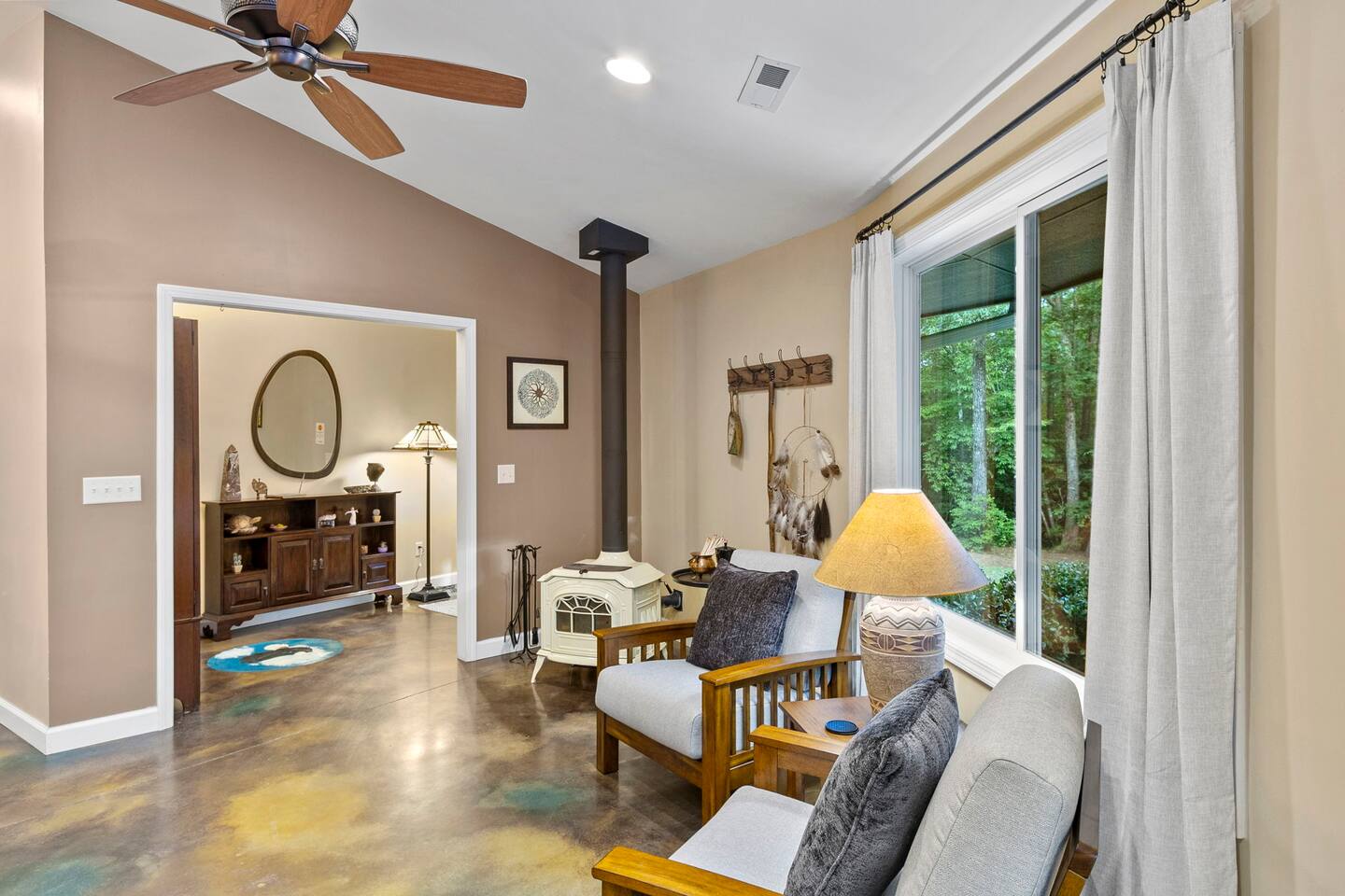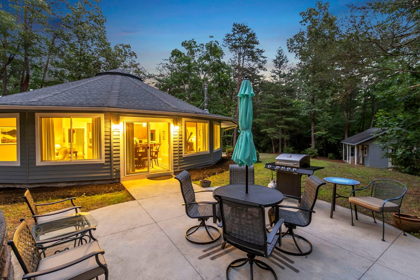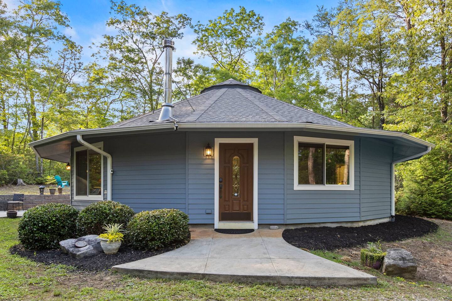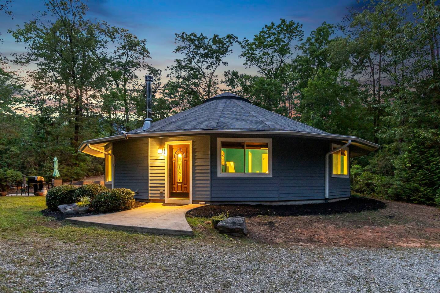 Escape to our one-of-a-kind yurt-inspired home, beautifully designed in a circular layout. This 3-bedroom, 2-bathroom house offers a truly unforgettable stay, blending modern comforts with a serene, natural setting. Highlights: Spacious and Cozy: Enjoy the open-concept living area featuring a fully stocked kitchen, comfortable seating, and a wood-burning stove. Outdoor Bliss: Relax by the fire pit under the string lights, cook up a feast on the grill, and dine on the patio surrounded by nature. Master Suite: The master bedroom boasts a king bed, a smart TV, a dedicated workspace, and an ensuite bath with a luxurious soaking tub. Additional Bedrooms: The second bedroom has a queen bed and smart TV, and the third bedroom is perfect for kids with twin bunk beds. Modern Amenities: Stay connected with WiFi and cable TV in the living area, smart tvs in both the master bedroom and queen bedroom. Log in to your favorite streaming services for a cozy movie night. Nature at Your Doorstep: Located just 10 minutes from Table Rock State Park, 15 minutes from Lake Keowee, 30 min from Lake Jocassee, and close to local attractions like Victoria Valley Vineyards and Table Rock Tea Company. Want more adventure? Downtown Greenville is only 45 minutes away, and Traveler's Rest is 25 minutes away. * Pets are welcome in our home with a one-time fee, automatically applied when you add your pet as a guest during booking **The lake and creek areas are private property, and any unauthorized access will be considered trespassing.** Book now for an unforgettable stay in our unique home, where you can relax, explore, and create lasting memories with family and friends.