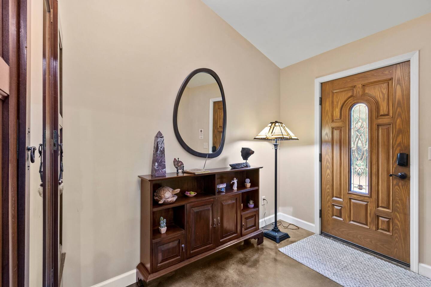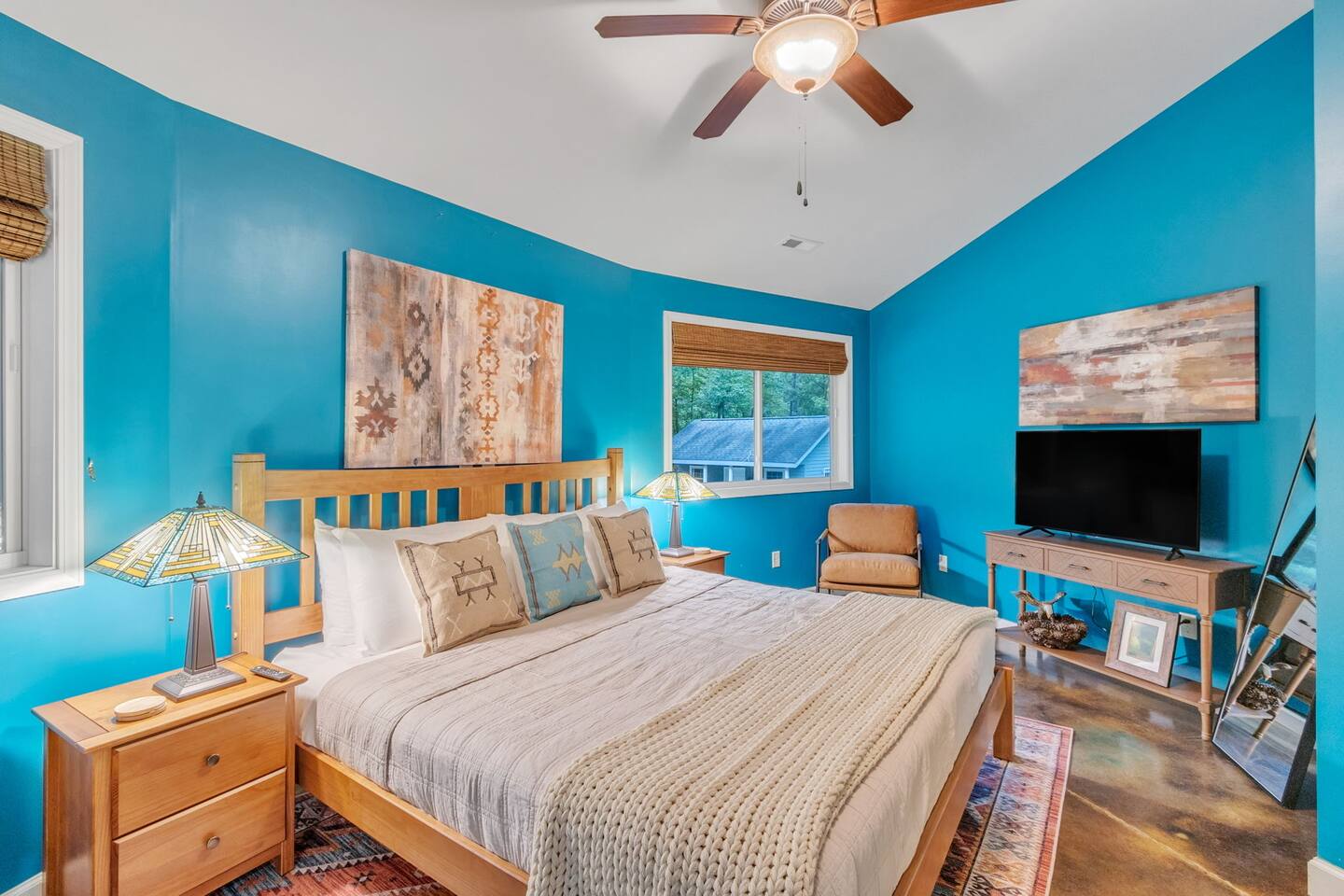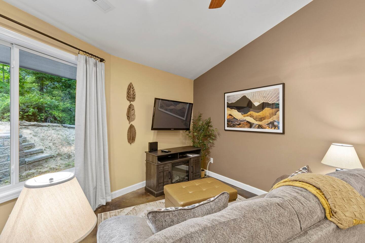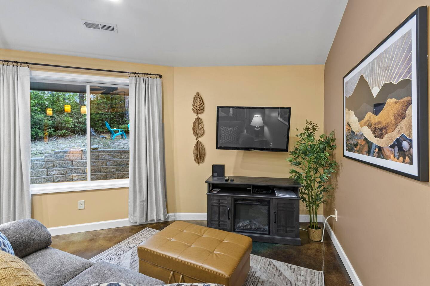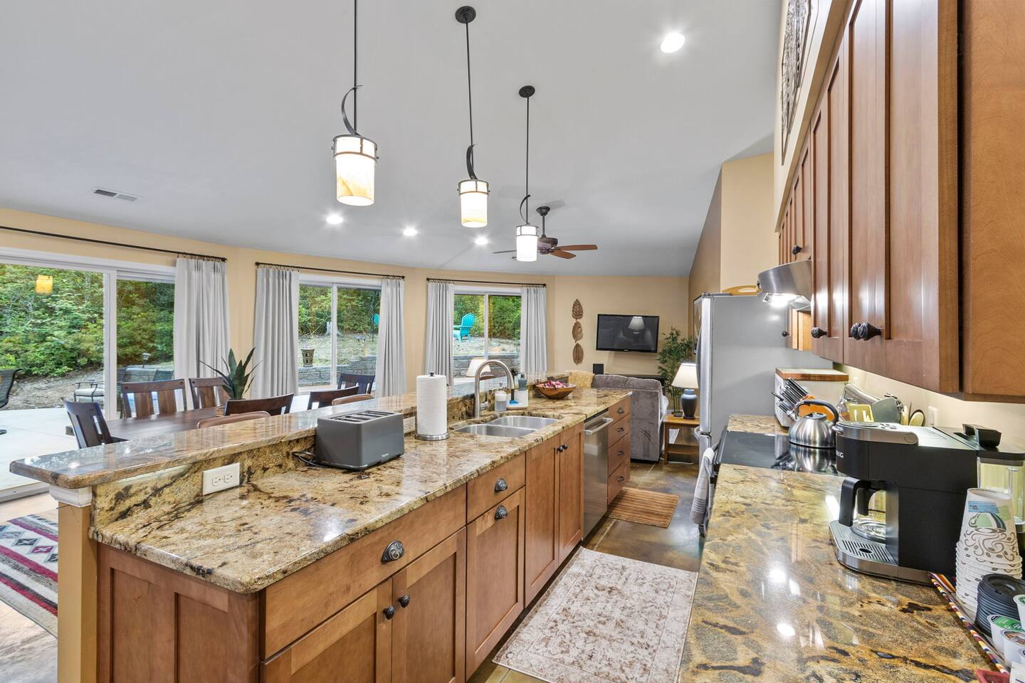 Escape to our one-of-a-kind yurt-inspired home, beautifully designed in a circular layout. This 3-bedroom, 2-bathroom house offers a truly unforgettable stay, blending modern comforts with a serene, natural setting. Highlights: Spacious and Cozy: Enjoy the open-concept living area featuring a fully stocked kitchen, comfortable seating, and a wood-burning stove. Outdoor Bliss: Relax by the fire pit under the string lights, cook up a feast on the grill, and dine on the patio surrounded by nature. Master Suite: The master bedroom boasts a king bed, a smart TV, a dedicated workspace, and an ensuite bath with a luxurious soaking tub. Additional Bedrooms: The second bedroom has a queen bed and smart TV, and the third bedroom is perfect for kids with twin bunk beds. Modern Amenities: Stay connected with WiFi and cable TV in the living area, smart tvs in both the master bedroom and queen bedroom. Log in to your favorite streaming services for a cozy movie night. Nature at Your Doorstep: Located just 10 minutes from Table Rock State Park, 15 minutes from Lake Keowee, 30 min from Lake Jocassee, and close to local attractions like Victoria Valley Vineyards and Table Rock Tea Company. Want more adventure? Downtown Greenville is only 45 minutes away, and Traveler's Rest is 25 minutes away. * Pets are welcome in our home with a one-time fee, automatically applied when you add your pet as a guest during booking **The lake and creek areas are private property, and any unauthorized access will be considered trespassing.** Book now for an unforgettable stay in our unique home, where you can relax, explore, and create lasting memories with family and friends.