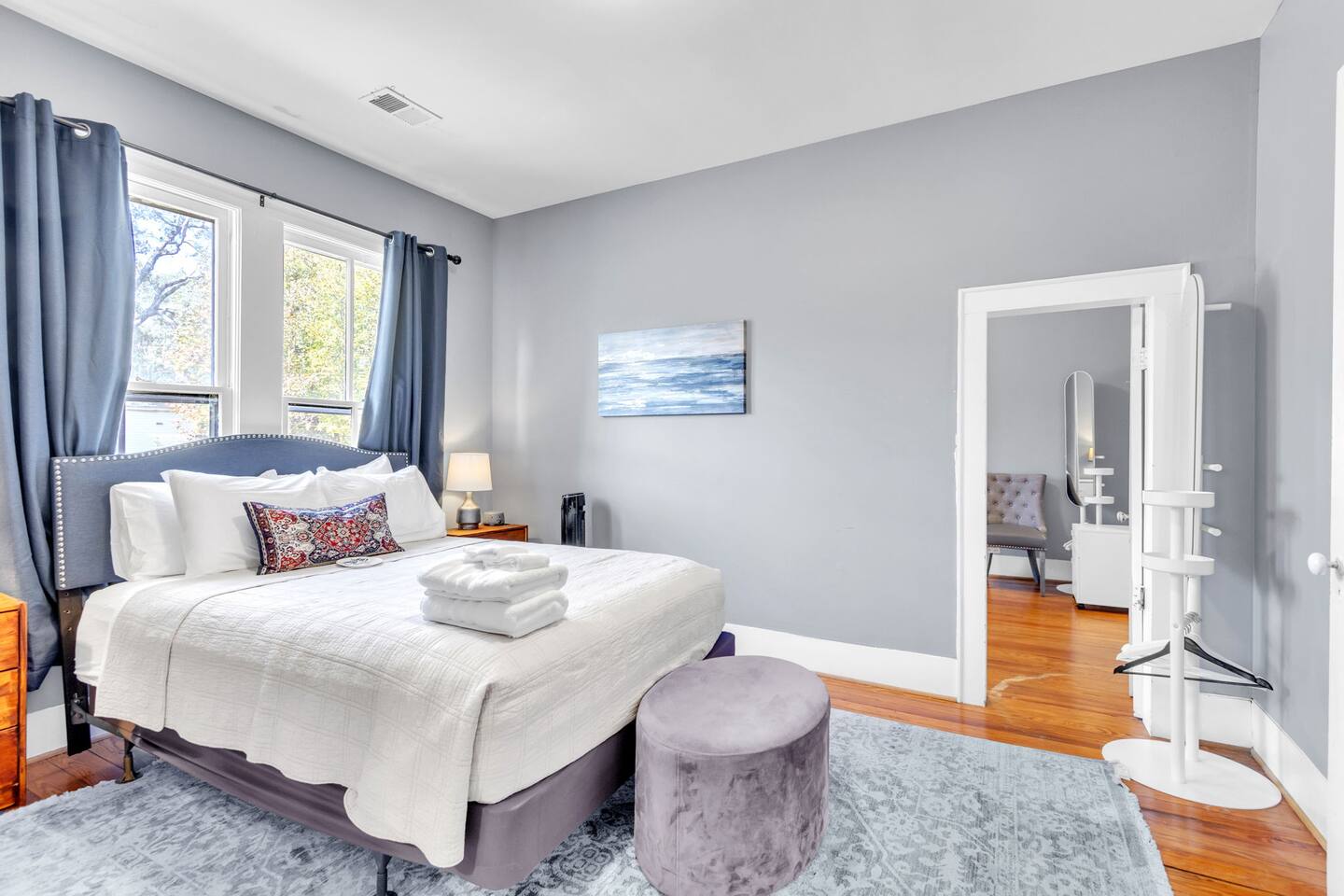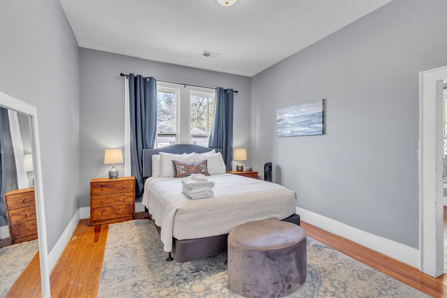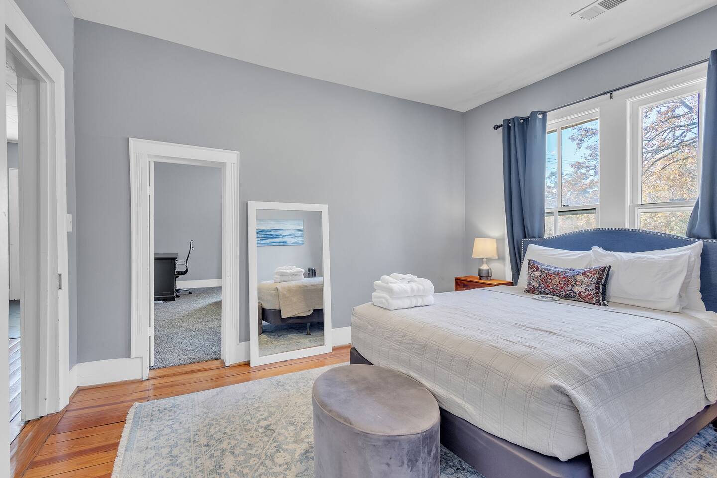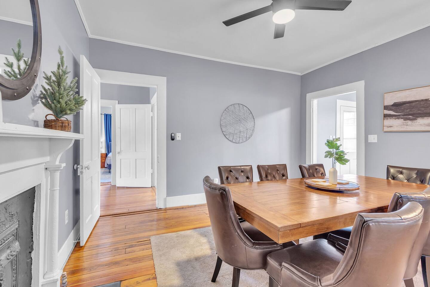 Welcome to The Southern Stoop – a newly refreshed, pet-friendly 3-bedroom, 1-bathroom home, ideally situated just a minute from Downtown Simpsonville and a 20-minute drive to Downtown Greenville. Blending classic Southern charm with modern comforts, this inviting home is perfect for family gatherings, cozy getaways, and anyone looking to experience the best of Simpsonville. Set on a spacious lot, The Southern Stoop offers multiple outdoor spaces designed for relaxation. Enjoy a screened-in porch for morning coffee, a cozy fire pit for marshmallow roasting, and the home’s namesake front stoop – perfect for watching the world go by with a sweet tea in hand. Inside, you’ll find thoughtfully updated spaces with the following highlights: - Entry Foyer: Step inside to a welcoming foyer featuring stylish decor and ample natural light. This space connects to various rooms and includes a side table with guest information and Wi-Fi details. Living Room: This warm, cozy space is ideal for gathering. It is furnished with a large sectional sofa, two armchairs, and a Smart TV equipped with ROKU (guests can log in with their own streaming accounts). The non-functional fireplace adds character to the room, making it the perfect spot for movie nights or unwinding after a day of exploring. - Master Bedroom: Immediately off the foyer, the master bedroom provides a peaceful retreat with a king-size bed, two nightstands, and a cozy sofa in the corner – perfect for enjoying your morning coffee. A desk with a monitor is available, offering a dedicated space for work or planning. - King Room: Connected to both the master bedroom and the foyer, this room features a comfortable king-size bed, nightstands, and a full-length mirror, giving it a spacious, relaxing ambiance. Queen Room: This third bedroom includes a queen-size bed, a nightstand, and a comfortable lounge chair. It connects directly to the shared bathroom, making it convenient for guests. - Shared Main Bathroom: All three bedrooms share a spacious bathroom featuring a tub/shower combination, double vanity, and toilet. The bathroom is fully stocked with essentials, including shampoo, conditioner, body wash, a hair dryer, and makeup washcloths. A washer and dryer are also provided for added convenience, and the tankless water heater ensures everyone gets a warm shower. - Dining Room: The formal dining area seats eight and provides the perfect setting for shared meals or game nights, with easy access to a closet stocked with a variety of board games. - Kitchen: The fully stocked kitchen includes modern appliances, a coffee bar, and everything you need for meal prep, from pots and pans to spices and oils. Gather around the coffee station each morning or cook a delicious meal easily. - Outdoor Spaces: Beyond the screened porch, the backyard includes a fire pit surrounded by Adirondack chairs and towering trees for shade and privacy. Parking is plentiful in the private driveway beside the home, and please note that no street parking is available. The Southern Stoop warmly welcomes pets with a one-time pet fee, which is automatically applied when you add a pet to your booking. The spacious layout and fenced areas allow pets to feel right at home. Location Highlights: You’ll be close to all the essentials and local favorites: - Warehouse at Vaughns (0.6 mi) - Ice Cream Station (0.6 mi) - Heritage Park (2.6 mi) - Downtown Greenville (20 min) Whether you’re here to enjoy Simpsonville’s charming main street, explore nearby parks, or relax in a cozy, thoughtfully refreshed space, The Southern Stoop is your ideal base for a Southern escape. We can’t wait to host you!