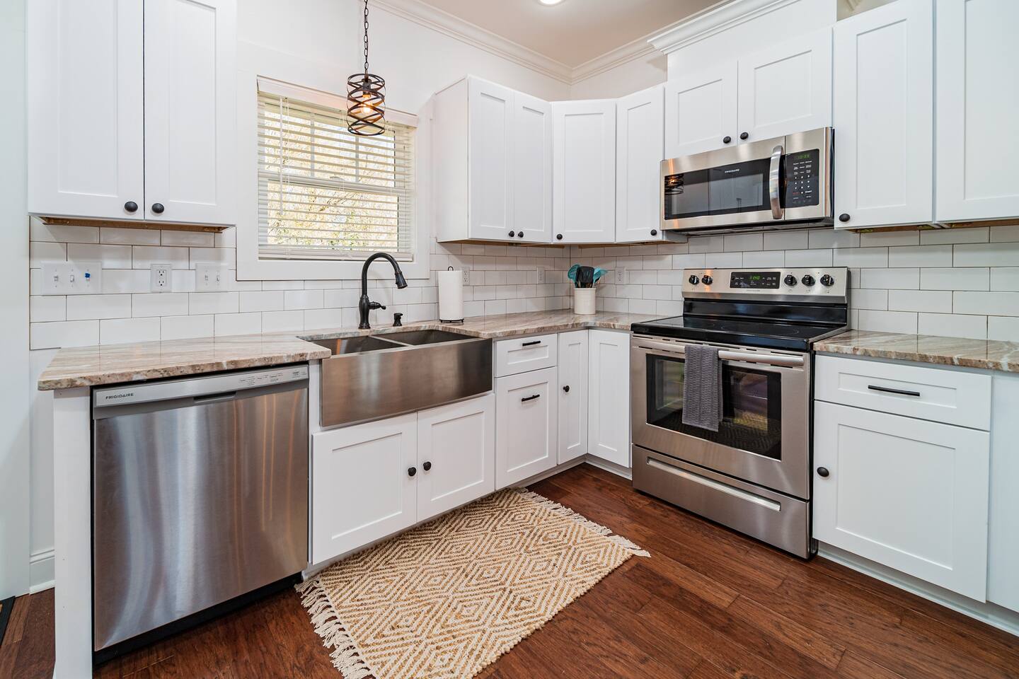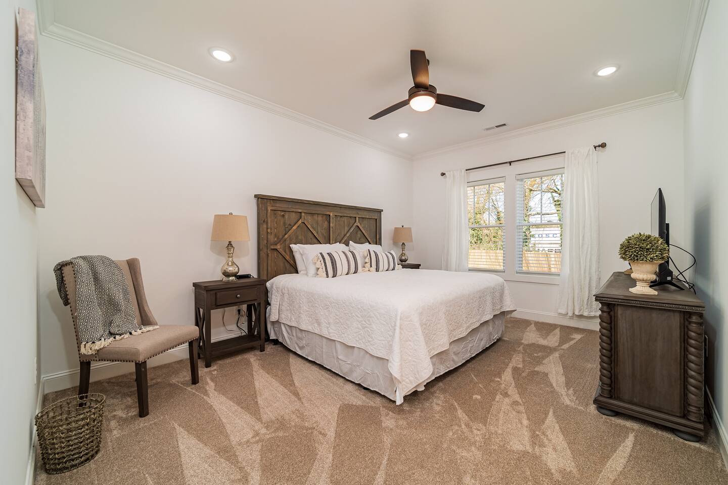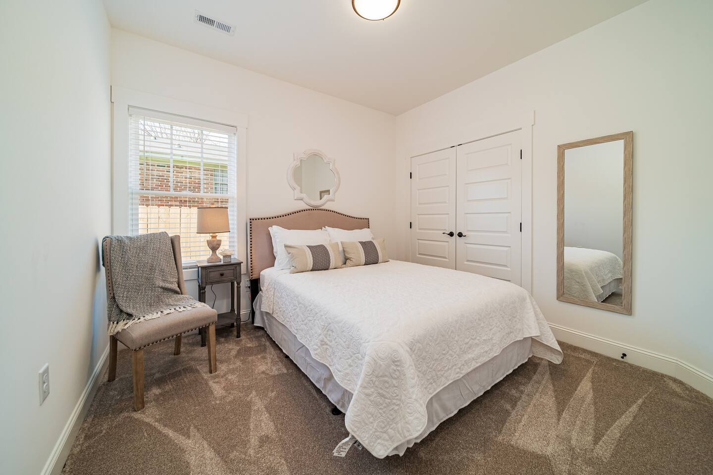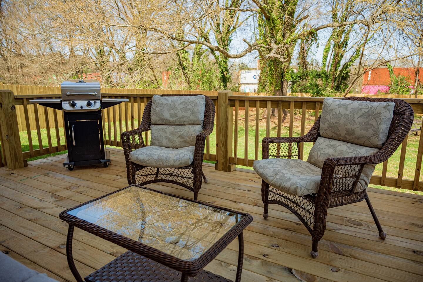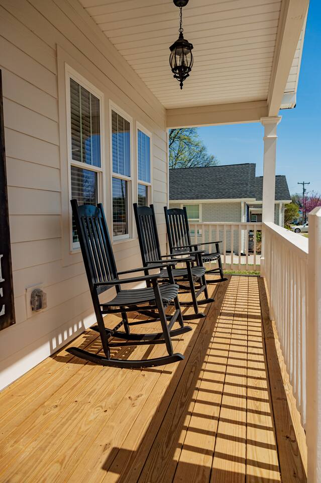 Discover the charm of Greenville, SC at The Village Roost, a freshly-built 3-bedroom, 2-bathroom house available for rentals ranging from 30 to 180 days. This fully-furnished home is conveniently located just 2 minutes from Poe West and the Village of West Greenville, and a brief 7-minute journey from the bustling Downtown. As you arrive, the southern front porch with its welcoming rocking chairs sets the tone for relaxation. Step inside to an open floor plan encompassing a living, dining, and kitchen area designed with comfort and style. The living space features a large, comfy L-shaped sectional, perfect for movie nights on the Smart TV with Roku (no cable). The dining area boasts a unique Farmhouse style table made from a reclaimed door, accommodating 6 people, plus an additional 3 stools at the kitchen peninsula. The journey to the kitchen reveals a large blackboard, artfully decorated by a local Greenville artist, offering recommendations to our favorite spots nearby. The kitchen itself is a delight, equipped with brand-new stainless steel appliances, ready for your culinary adventures. Step outside from the kitchen to a deck with seating for 4 and a gas grill, extending to a fenced yard with additional seating and a fire pit (wood not provided). Pet lovers will be happy to know that their furry friends are welcome (with a fee of $250 for the first pet and $100 for each additional pet). The Village Roost comfortably sleeps 6 guests across three bedrooms: a Twin room with two beds and ample closet space, a Queen bedroom with a large closet, dresser, and a cozy chair, and a secluded master bedroom with a King bed, a large dresser, nightstands, and a TV (streaming services only, no cable). The master suite also includes an ensuite bathroom with a sleek glass door shower and double vanity. A second bathroom is equipped with a tub/shower combination and single vanity. Additionally, a laundry room with provided detergent is available for your convenience. This home comes complete with all lawn care, utilities, internet (streaming-ready TV, no cable), and trash pick up included. The rental terms include a $750 security deposit (refundable), a $250 non-refundable pet fee (plus $100 for each additional pet), and a $315 cleaning fee. Experience Southern hospitality with a modern twist at The Village Roost - your ideal home away from home in Greenville.