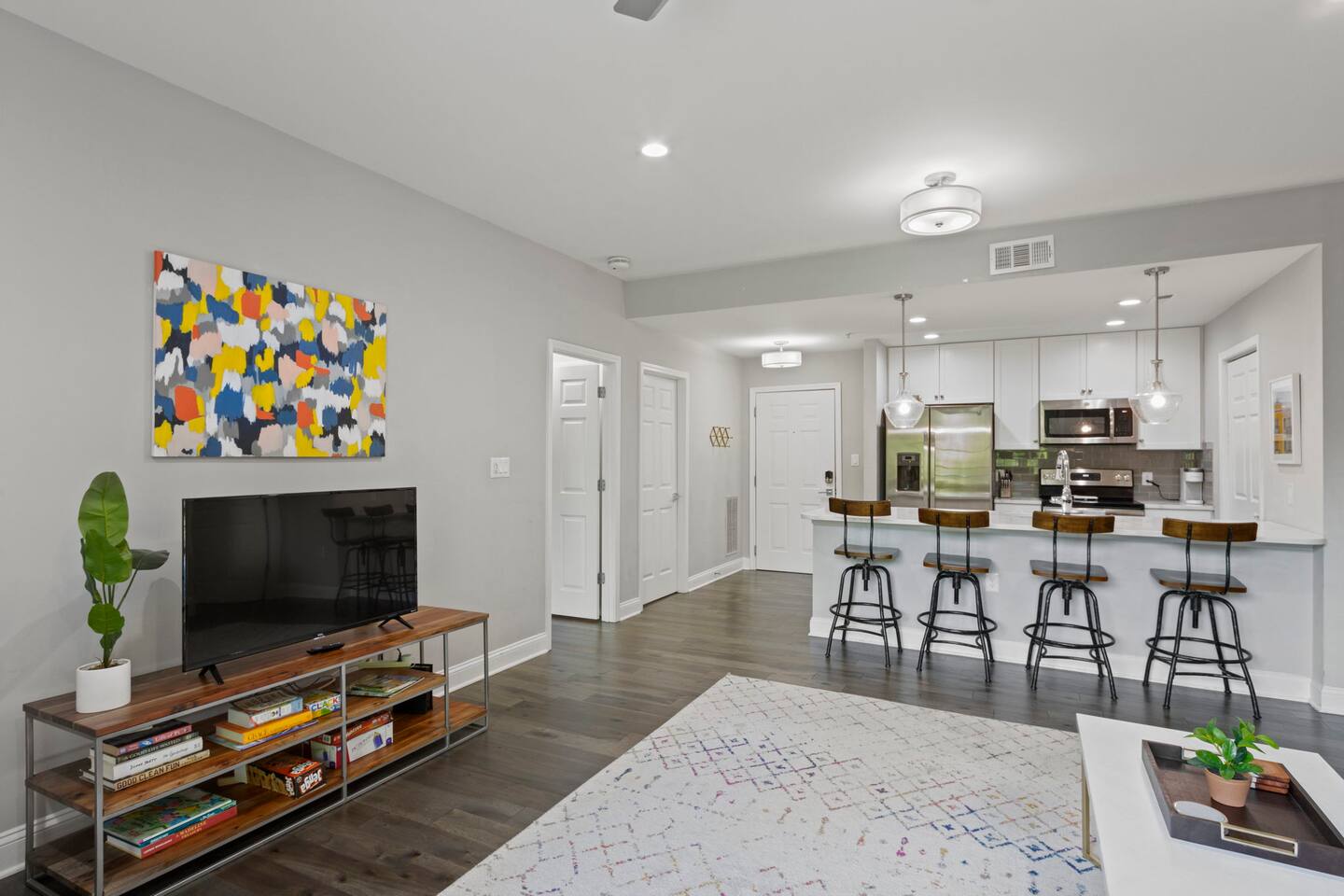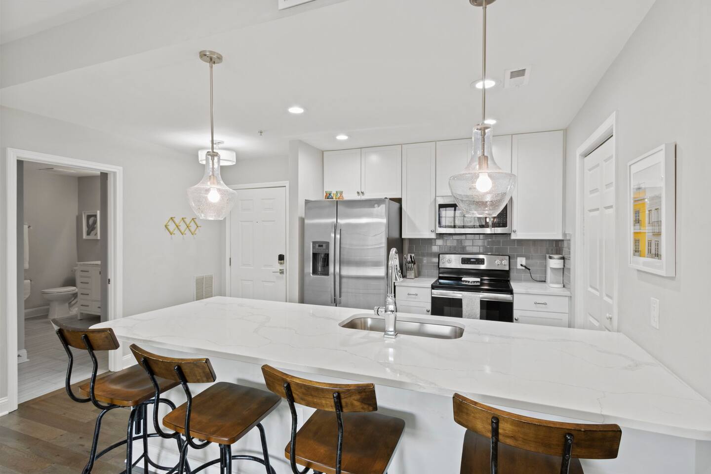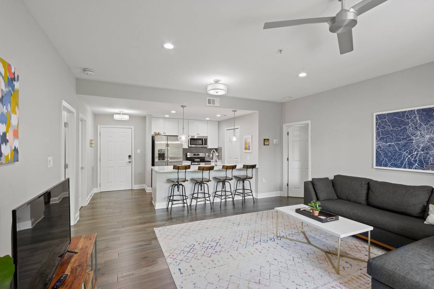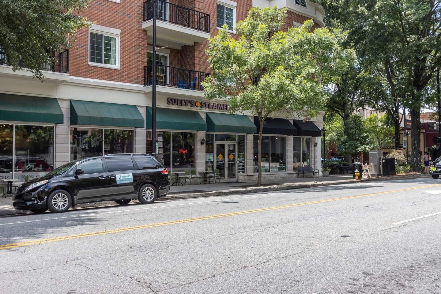 Guests will enter our condo from an elevator off of Main Street. Parking is available in the nearby Spring St Garage for $7/day. Once inside, guests will enjoy a beautiful kitchen with bar seating for four, a lovely sectional sofa and accent chair, and a TV that they can use to access their personal streaming services (no cable). Off of the living room is a small balcony overlooking the downtown area. The bedrooms are located on each side of the living room. The left bedroom has a Queen bed, nightstands, and a chair in the corner. The attached bathroom has a single vanity, toilet, and stall shower. On the other side of the unit is our second bedroom, featuring a Queen bed and a sofa. This bedroom also has an en-suite bathroom with a toilet, single vanity, and stall shower. Laundry is available for guests and is located in the closet right off of the kitchen. We think of everything, so you don't have to. So get ready, pack your bags, and come experience Greenville from our amazing condo!